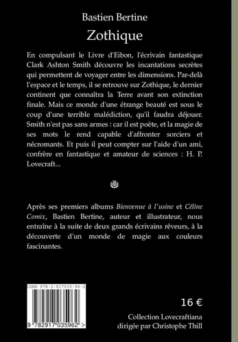En compulsant le Livre d'Eibon, l'écrivain fantastique Clark Ashton Smith découvre les incantations secrètes qui permettent de voyager entre les dimensions. Par-delà l'espace et le temps, il se retrouve sur Zothique, le dernier continent que connaîtra la Terre avant son extinction finale. Mais ce monde d'une étrange beauté est sous le coup d'une terrible malédiction, qu'il faudra déjouer. Smith n'est pas sans armes : car il est poète, et la magie de ses mots le rend capable d'affronter sorciers et nécromants. Et puis il peut compter sur l'aide d'un ami, confrère en fantastique et amateur de sciences : H. P. Lovecraft... Après ses premiers albums "Bienvenue à l'usine" et "Céline Comix", Bastien Bertine, auteur et illustrateur, nous entraîne à la suite de deux grands écrivains rêveurs, à la découverte d'un monde de magie aux couleurs fascinantes.