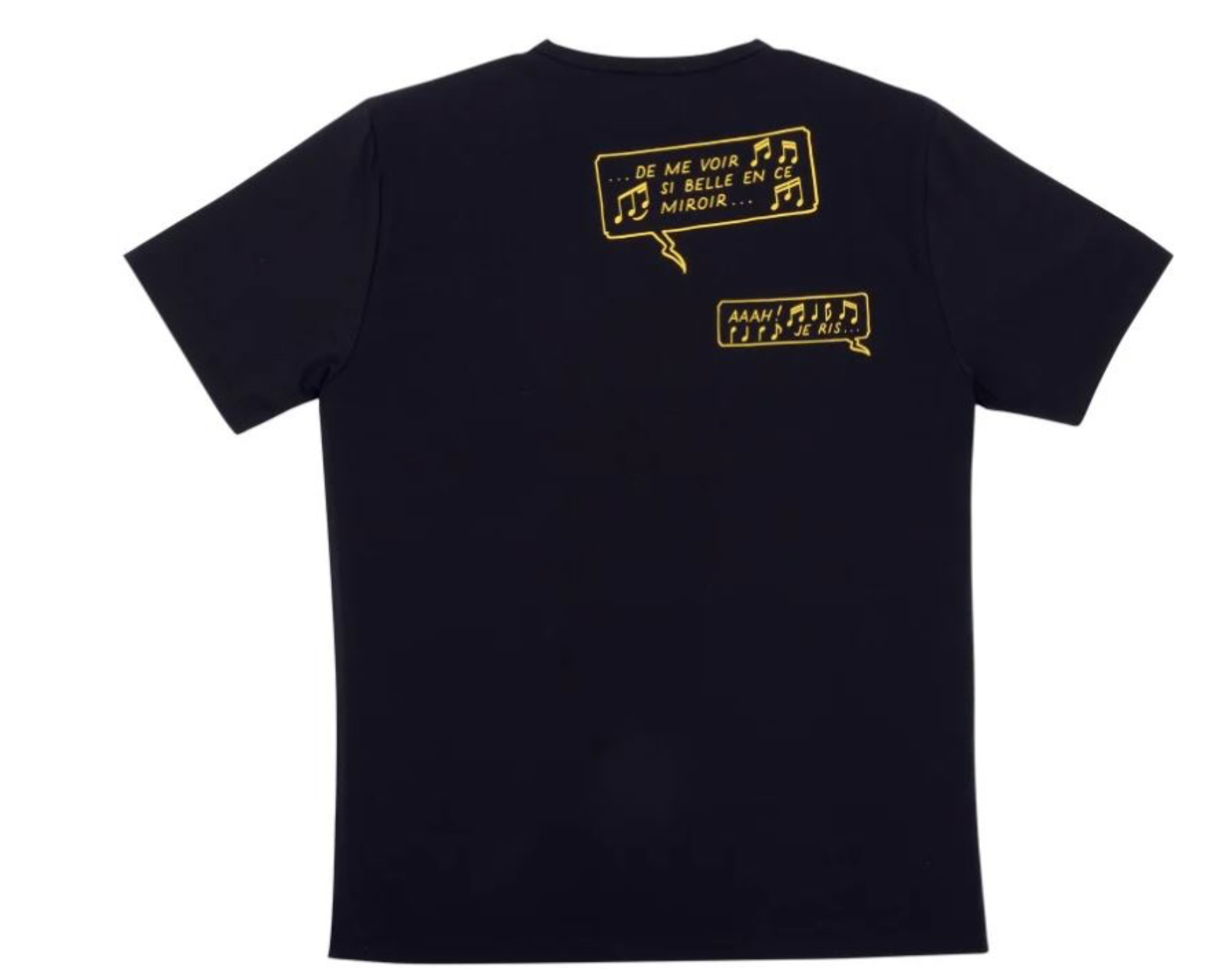 Indispensable dans toute garde-robe : ce t-shirt coloré avec des motifs graphiques amusants tirés des Aventures de Tintin. Le jeune reporter est ici au centre, dans la même posture que sur la couverture de l'album Les Bijoux de la Castafiore, faisant face au lecteur avec un doigt sur la bouche pour indiquer... chut, on tourne !