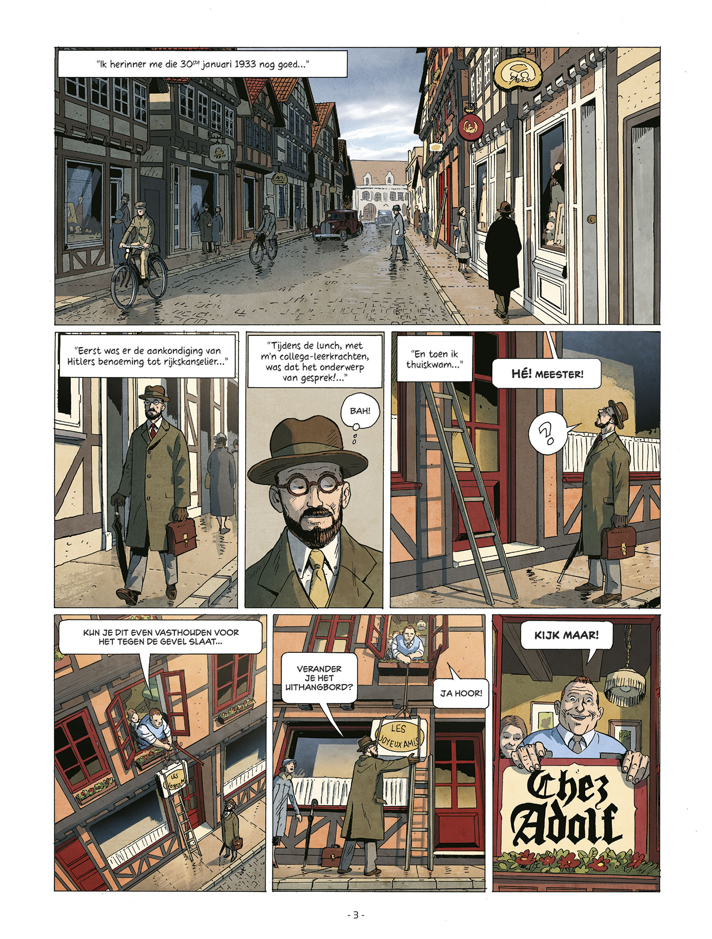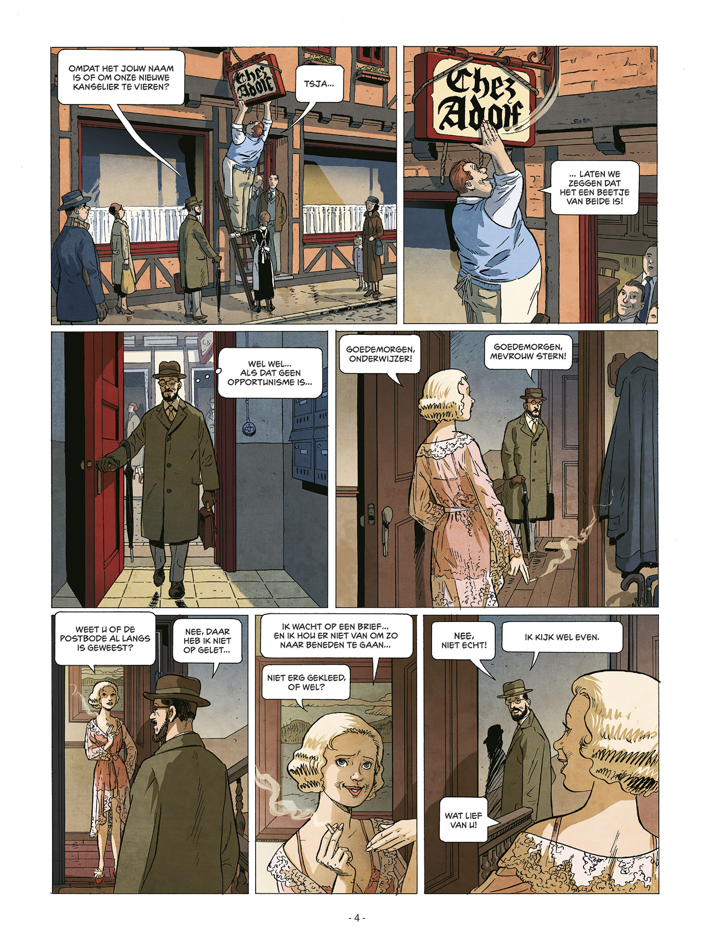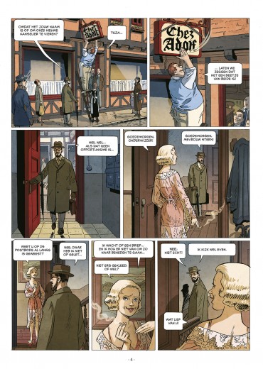 Gelimiteerde Hardcover Wat zouden wij hebben gedaan vanaf 1933 als wij Duitsers waren geweest? Aan de hand van de levensloop van de bewoners van een klein gebouw in een Duitse stad, schetst Chez Adolf de opkomst van het nazisme en de onomkeerbare schade die het teweegbrengt. Op 30 januari 1933 komt Adolf Hitler aan de macht in Duitsland. Op die dag krijgt de bar op de benedenverdieping van het gebouw waar professor Karl Stieg woont, een nieuwe naam. De bar wordt vanaf dan Bij Adolf genoemd, naar de eigenaar van de zaak. Het is ook de dag waarop Karl besluit een dagboek te gaan bijhouden. Geen van hen kan vermoeden wat er de komende jaren nog zal gebeuren…