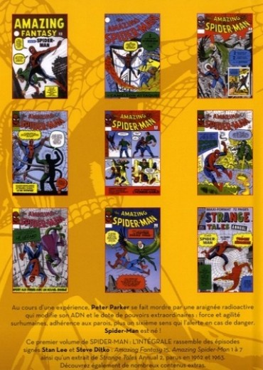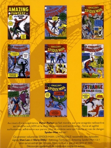 Au cours d'une expérience, Peter Parker se fait mordre par une araignée radioactive qui modifie son ADN et le dote de pouvoirs extraordinaires : force et agilité surhumaines, adhérence aux parois, plus un sixième sens qui l'alerte en cas de danger. Spider-Man est né ! Ce premier volume de SPIDER-MAN : L'INTEGRALE rassemble des épisodes signés Stan Lee et Steve Ditko : Amazing Fantasy 15, Amazing Spider-Man 1 à 7 ainsi qu'un extrait de Strange Tales Annual 2, parus en 1962 et 1963. Découvrez également de nombreux contenus extras.