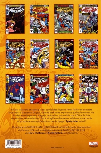 Timide, introverti et rejeté par ses camarades, le jeune Peter Parker se consacre tout entier à la science. Un jour, il prend part à une expérience qui bouleverse sa vie. Il se fait mordre par une araignée radioactive qui modifie son ADN et le dote de pouvoirs extraordinaires : force et agilité surhumaines, adhérence aux parois et un sixième sens qui l'alerte en cas de danger. Spider-Man est né ! Ce volume de Spider-Man : L'intégrale rassemble toute la production de l'année 1979, soit les épisodes Amazing Spider-Man 188 à 199 de Marv Wolfman et Keith Pollard, et l'Annual 13.