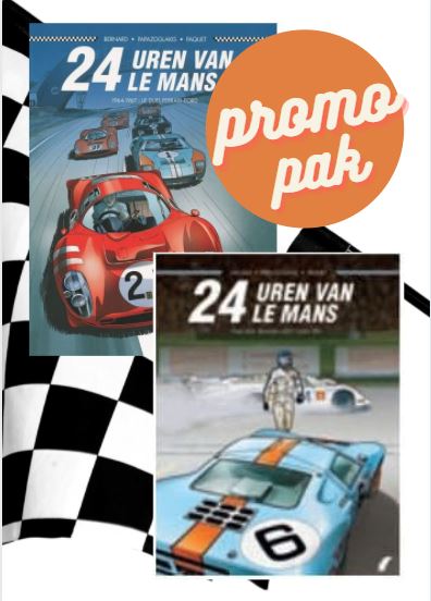 PROMOPAKKET met de eerste twee delen ( osftcover) van deze titel over de 24 uren van Le Mans. 1969. Aan de start van de 24 Uren van Le Mans staan alle piloten klaar om naar hun bolides te rennen. Alle piloten, op één na: Jacky Ickx. Uit protest tegen de ‘Le Mansstart’ en naar aanleiding van het ongeluk van zijn vriend Willy Mairesse tijdens de regenachtige editie van 1968, wandelt Ickx naar zijn GT40. Hij vertrekt als laatste met zijn verouderde Ford-model en haalt een na een de te duchten Porsches in. Ondanks zijn jonge leeftijd laat het Belgische wonderkind naast zijn pure snelheid ook een uitstekend gevoel voor tactiek zien… In dit nieuwe album van de 24 Uren van Le Mans lees je over twee van ‘oerwagens’ in de spotlights: twee keer haalt Ford het met zijn mythische GT40 tegen een reeks recentere modellen
