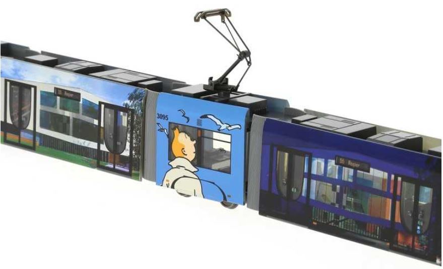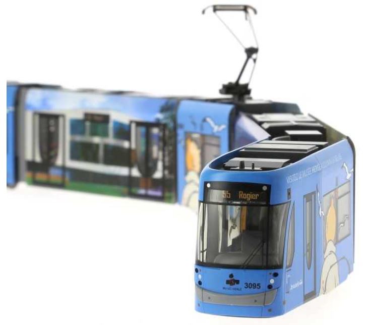 Kuifjestram - MIVB Moulinsart is verheugd een nieuw partnerschap met de MIVB aan te kondigen. In 2016 rolde een schitterende tram versierd met de afbeeldingen van Kuifje en het Hergé Museum op het MIVB-netwerk (in het Brussels Hoofdstedelijk Gewest). Moulinsart en de MIVB presenteren nu het elektrische model van deze tram, schaal HO - 1:87, geproduceerd in een gelimiteerde serie en genummerd tot 1000 exemplaren, vergezeld van een certificaat van echtheid. Breedte: 2,7 cm Lengte: 37 cm Hoogte: 4,5 cm Bevat certificaat van echtheid Genummerd: ja Oplage: 1.000 ex