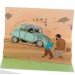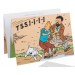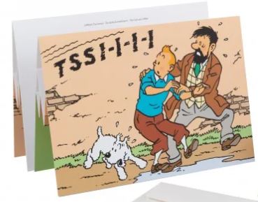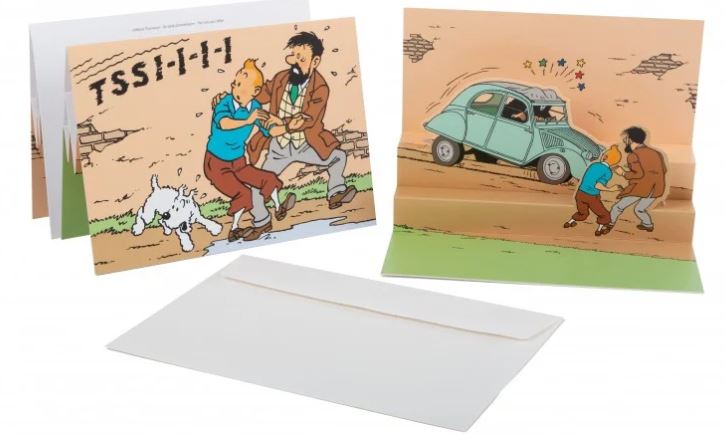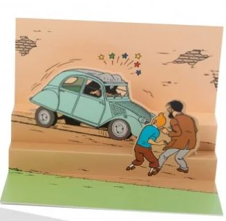 pop-up postkaart met wagens op het voorplan uit de avonturen van Kuifje. Geleverd met omslag
