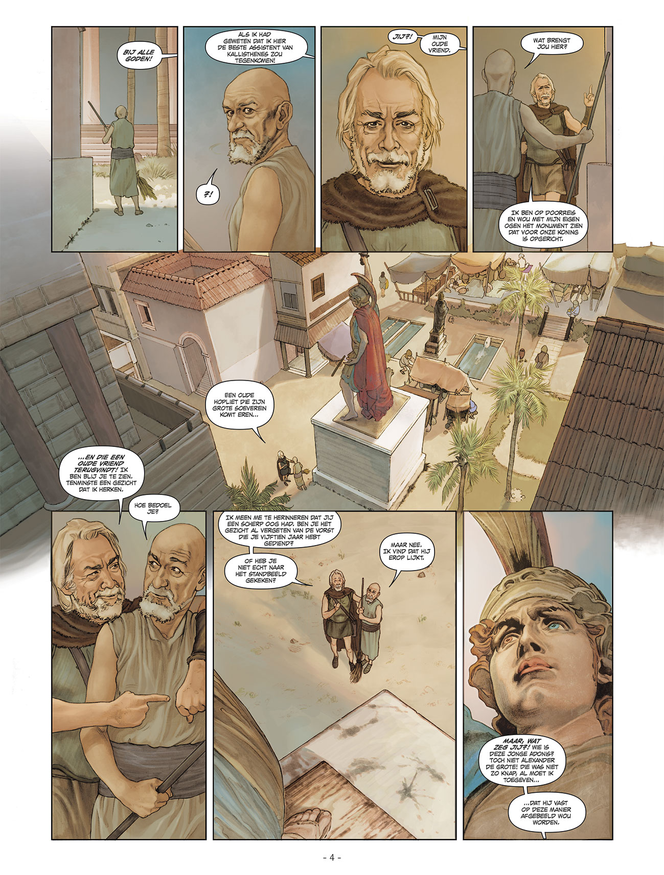 Met uitgebreid, verhelderend achtergronddossier over de mythevorming rond Alexander de Grote • De collectie ‘Zij schreven geschiedenis’ staat garant voor goed gedocumenteerde, boeiende verhalen over de groten der aard 300 v.C., Memphis. In de schaduw van het majestueuze beeld van Alexander de Grote mijmeren een hopliet en een schrijver, twee oude vrienden, over de roemrijke veldtochten die ze hebben meegemaakt, onder aanvoering van de keizer. Alexander III van Macedonia, beter bekend als Alexander de Grote, was een geboren veroveraar, een geniale strateeg, een koning met goddelijke allures… Geen gebrek aan superlatieven om de man te beschrijven die een klein koninkrijk in het noorden van Griekenland omvormde tot het grootste rijk aller tijden. Een grenzeloze ambitie die gekenmerkt wordt door het verlangen om de Griekse en Perzische wereld te verenigen. Een vergeefs streven, want zoals alle uitzonderlijke mensen werd Alexander de Grote zowel bewonderd als gevreesd. Wat gaat er dus precies schuil achter zijn legende?