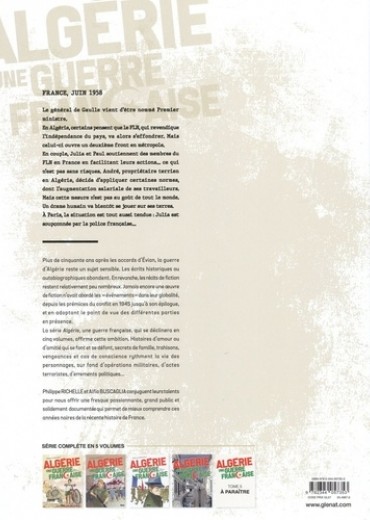 France. Juin 1958. Le général de Gaulle Vient d'être nommé Premier ministre. En Algérie, certaine pensent que le FLN, qui revendique l'indépendance du pays, va alors s'effondrer. Mais celui-ci oeuvre un deuxième front en métropole En couple, Julia et Paul soutiennes des membres du FLN en France en facilitant leurs action... ce qui n'est pas sans risques André, propriétaire terrien en Algérie, décide d'appliquer certaines normes, dont l'augmentation salariale de ses travailleurs. Mais cette mesure n'est pas au gout de tout le monde. Un drame humain va bientôt se jouer sur ses terres. A paris, la situation est tout aussi tendue : Julia est soupçonnée par la police française... Plus de cinquante ans après les accords d'Evian, la guerre d'Algérie reste un sujet sensible. Les écrits historiques ou autobiographiques abondent En revanche,les récits de fiction restent relativement peu nombreux. Jamais encore une oeuvre de fiction n'avait abordé les "événements" dans leur globalité, depuis les prémices du conflit en 1845jusquä sen épilogue, et en adoptant le point de vue des différentes parties en présence. La série Algérie, une guerre française, qui se déclinera en cinq volumes, affirme cette ambition. Histoires d'amour ou d'amitié qui se font et se défont, secrets de famille, trahisons, vengeances et cas de conscience rythment la vie des personnages, sur fond d'opérations militaires, d'actes terroristes, d'énçments politiques...