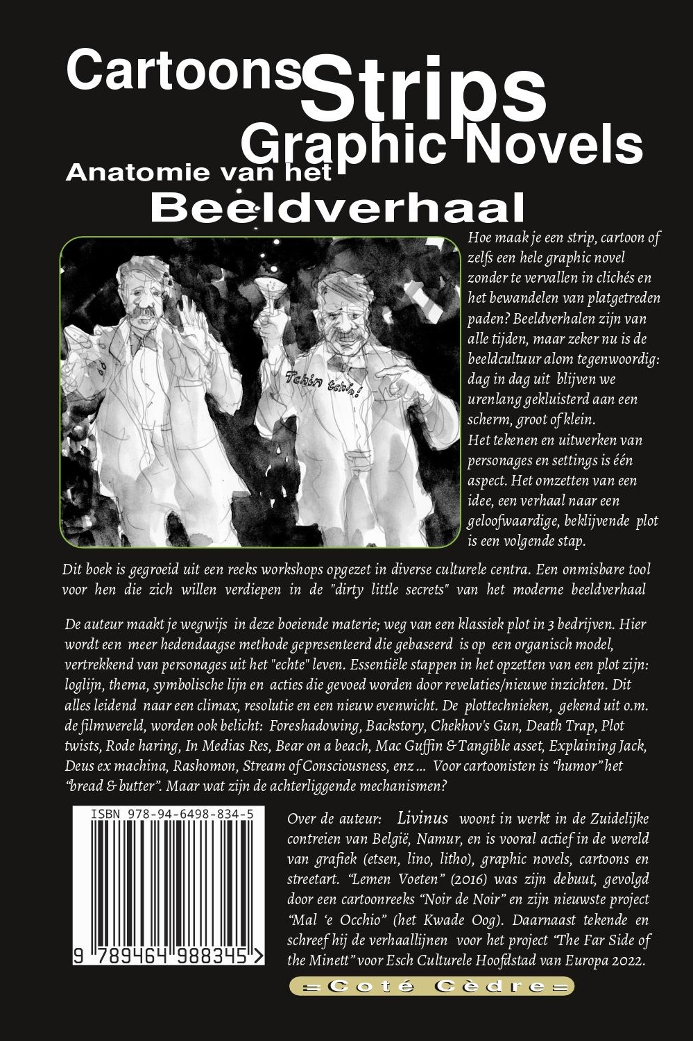 À propos de l'auteur : Livinus vit et travaille dans le sud de la Belgique, à Namur. Il est actif dans le domaine des arts graphiques (gravure, linogravure, lithographie), des romans graphiques, des dessins animés et de l'art de rue. Son premier ouvrage, « Lemen Voeten » (2016), a été suivi de la série de dessins humoristiques « Noir de Noir » et de son nouveau projet « Mal 'e Occhio » (Le Mauvais Œil). Il a également écrit et dessiné les intrigues pour le projet « The Far Side of the Minett » dans le cadre d'Esch, Capitale européenne de la culture 2022.
