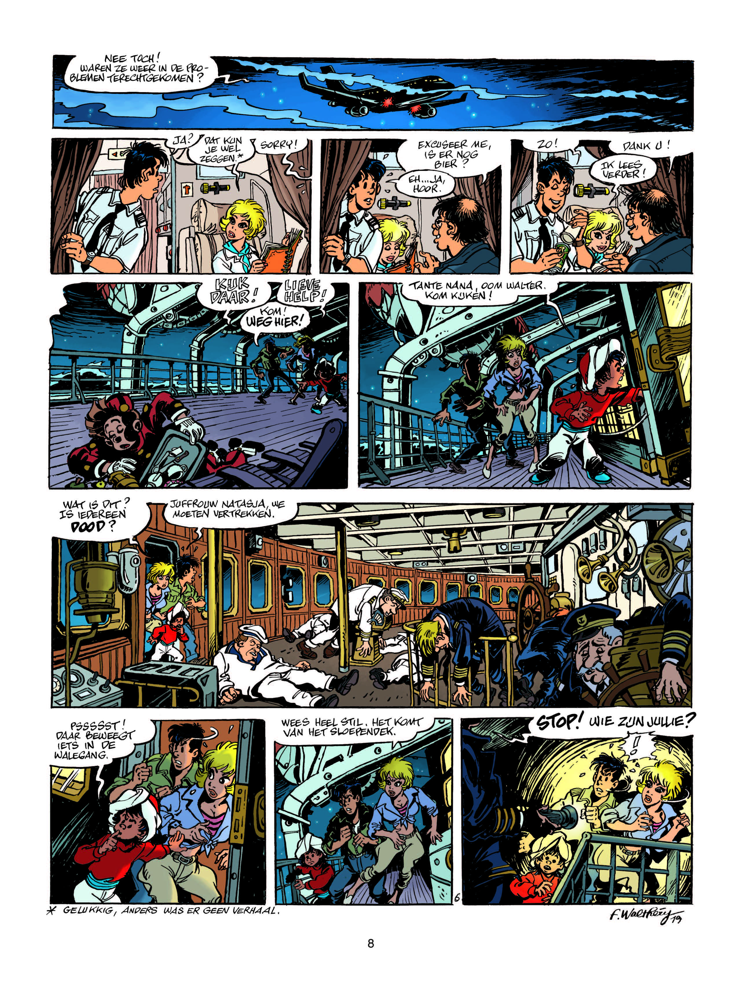 Tu pensais peut-être que les aventures de la grand-mère de Natasja et du grand-père de Walter étaient terminées après ce qui s'était passé en Nouvelle-Calédonie ? Eh bien non, heureusement ! Sous un ciel où une lumière mystérieuse brille, ils naviguent à bord d'un navire de croisière à l'arrêt, en plein milieu de l'Océan Pacifique. Les passagers et l'équipage sont tous endormis, et le coffre-fort a été forcé. Un coup réussi d'un groupe de voleurs étranges, et ce n'est sûrement pas le dernier… À moins que la grand-mère de Natasja n'y mette son grain de sel… car elle est aussi courageuse et séduisante que sa petite-fille, et elle a un atout dans sa manche : Aprillied, son revolver préféré !