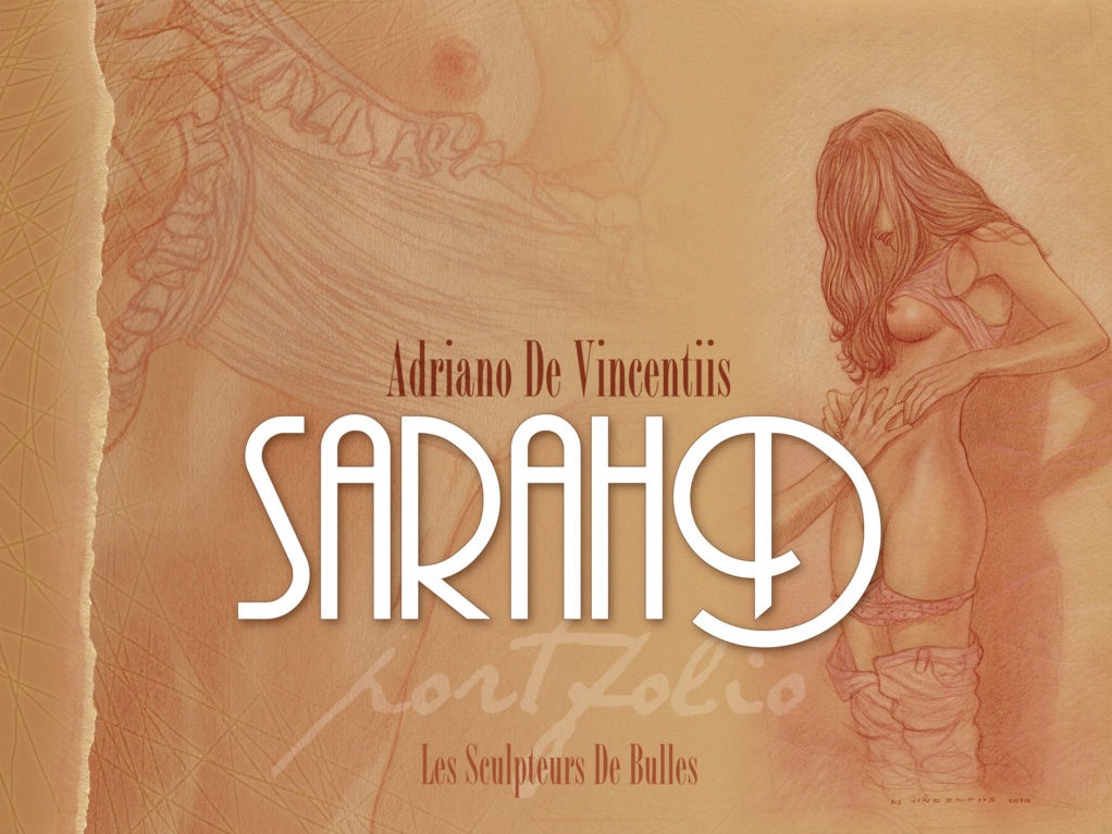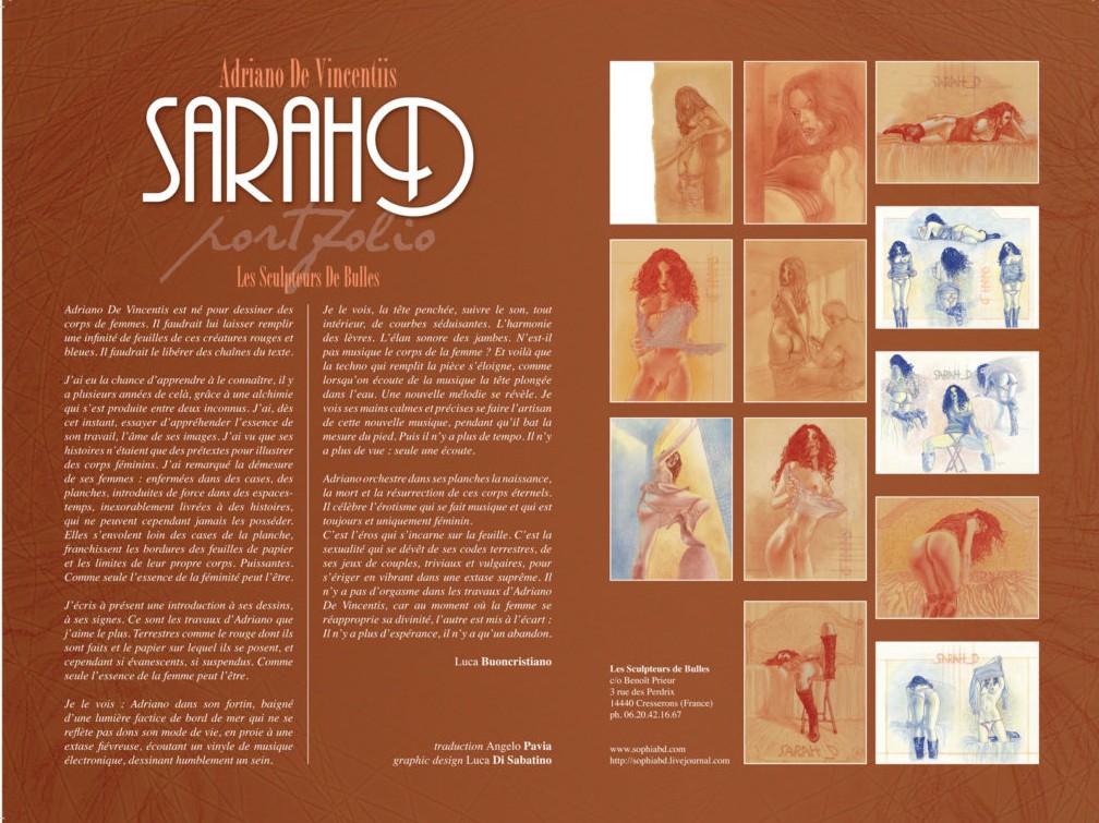 Portfolio Sarah D. : 100 ex ; numérotés et signés ; 12 offsets en quadrichromie format 30×40 cm en tonalités de rouge ou de bleu. Toutes les illustrations sont numérotées et signées par Adriano De Vincentiis.