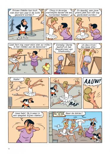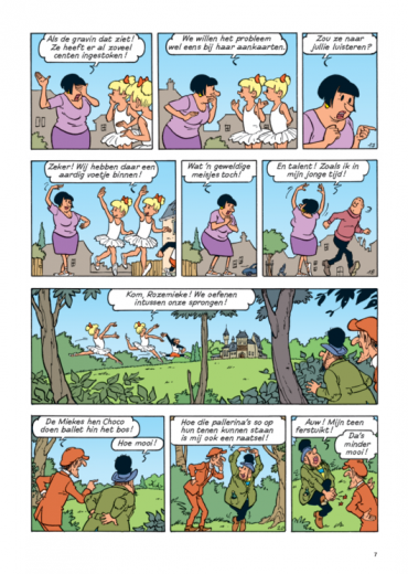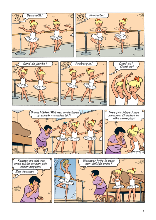 De balletschool van Zonnedorp bestaat 100 jaar en geeft een jubileumvoorstelling: Het Zwanenmeer van Tsjaikovski. Maar de prima ballerina danst als een kip zonder kop en de Miekes moeten op zoek naar een goede vervangster. De gravin van Stiepelteen, die wel wat connecties heeft in de balletwereld, regelt dat in een handomdraai. Nu nog een prins die de prima ballerina op het podium kan begeleiden. Wie anders dan Jommeke kan de ballerina’s uit de nood helpen! De Miekes leiden de dans in dit verfrissend avontuur.