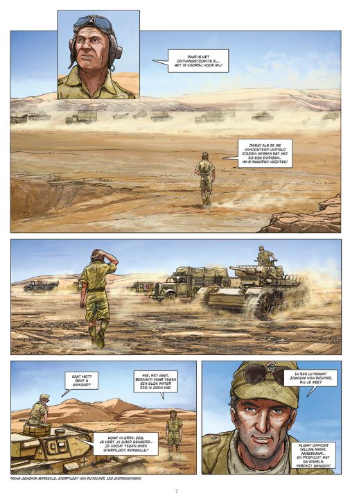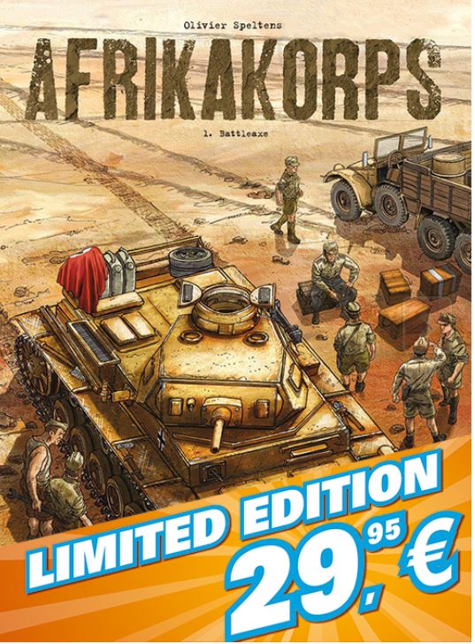 - Hardcover 'Afrikakorps' deel 1 met andere covertekening - 1 Prachtige stand-up display van een tank - Oplage 444 exemplaren Speltens Olivier kennen we van “ De hel van het Oostfront “. Een verhaal vertellen vanuit het standpunt van de Duitsers viel niet in goede aarde bij alle uitgevers. Uiteindelijk vond hij bij Paquet de nodige steun. Speltens wil vooral de gevoelens van de soldaten, wat ze meemaakten en wat hen motiveerde om de energie te vinden om door te gaan met een oorlog die hij wist te verliezen…. Daarom baseert hij zich op historische feiten, biografieën, documentatie over die periode (hierbij soms bijgestaan door wat lezers hem toesturen). Het Storyboard en scenario schrijft hij volledig zelf met wat correcties indien nodig van zijn uitgever. Dit resulteerde weeral in een waarheidsgetrouw, spannend avontuur die in deze luxe versie reeds een collectors item geworden is. Zijn nieuwe project zou gaan over een gekende Japanse piloot die gevochten heeft in de Stille Oceaan tegen de Engelse, Australiërs en vooral Amerikanen…. Op 14 februari 1941 landen de Duitsers in Tripoli (Libië) bij de 5th Light Division. De 15de Pantserdivisie zal daar één maand later landen. De situatie is kritiek en het leger vertrekt (na een training van vier weken) onmiddellijk richting El-Agheila om op de Engelsen te jagen. De Engelsen overschatten de aantallen van de Duitse troepen en worden al snel uit El-Agheila verdreven. Op 4 april wordt Bengazhi ingenomen, waardoor luitenant-generaal Erwin Rommel vrij spel heeft om Tobruk aan te vallen... Afrikakorps is een nieuw drieluik van Olivier Speltens De Hel van het Oostfront