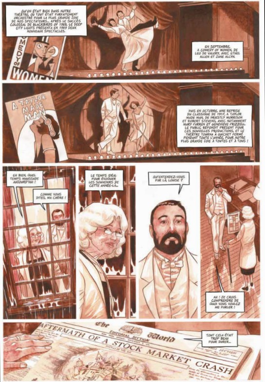 Deep City Lights, écrit par Ben Prieur et dessiné et mis en couleur en sépia par Djief, t’invite à poursuivre les pérégrinations de Louise Pembleton de 1926 à 1930, des avenues de New York à la plage de Cape May, des rues de Philadelphie aux plaines de Dodge City, des salles de rédaction de Lady’s aux lieux d’exposition et de spectacle les plus en vogue, tout en redécouvrant les noms et les œuvres de nombreuses stars de l’époque !