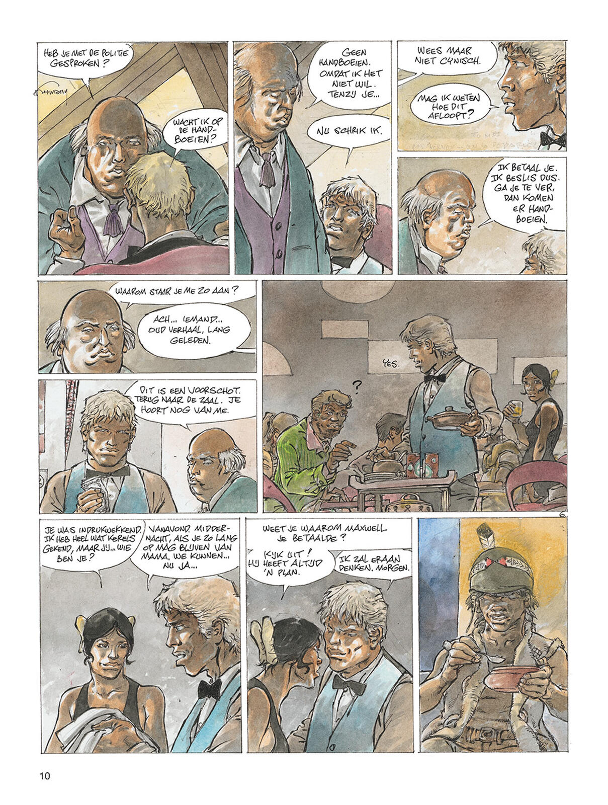 Een figuur waarin Jeremiah op blz. 10 prent 5 iemand anders lijkt te herkennen? Maar wie? Sam Toshida, de vader van Lena uit “Het Woedende Water”? Mr. Birmingham uit het allereerste album “De nacht van de roofvogels”? Of is het misschien Senior Rostov uit “De Kreeftenmand”? Feit is dat er wat sleet komt op de figuren, niet alleen op de hoofdfiguren, maar ook op de slechteriken.