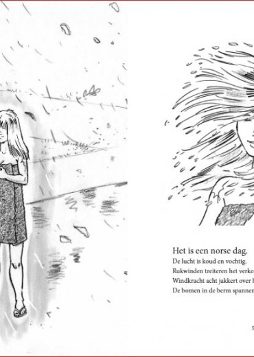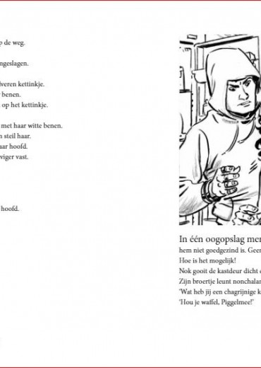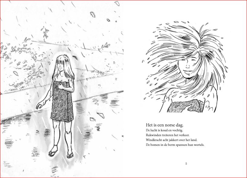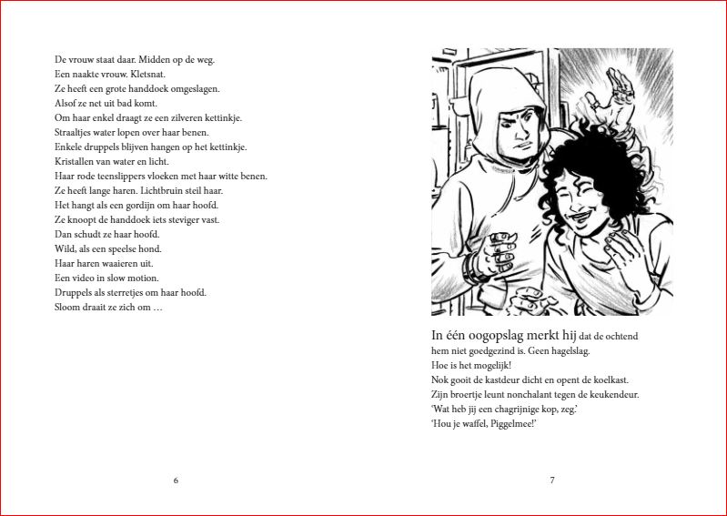 Een snel boek vol korte fragmenten en illustraties waarin de fantasie en werkelijkheid van twee tieners samenvloeit. Voor liefhebbers van strips en graphic novels vanaf 12 jaar. Het is een norse dag. De lucht is koud en vochtig. Rukwinden treiteren het verkeer. Windkracht acht jakkert over het land. De bomen in de berm spannen hun wortels. De vrouw staat daar. Midden op de weg. Een naakte vrouw. Kletsnat. Ze heeft een grote handdoek omgeslagen. Nok en Nena fietsen naar school. Door een wegomlegging moeten ze een andere route nemen. In de Zeebonenlaan zien ze ineens een bizarre verschijning. Alleen zien ze niet hetzelfde! Als ze van de shock bekomen zijn, besluiten Nok en Nena een experiment uit te voeren … Een snel, vlot leesbaar boek waarin twee jongeren in een parallelle werkelijkheid terechtkomen. Voor liefhebbers van een spannend verhaal in woord en beeld vanaf 12 jaar.
