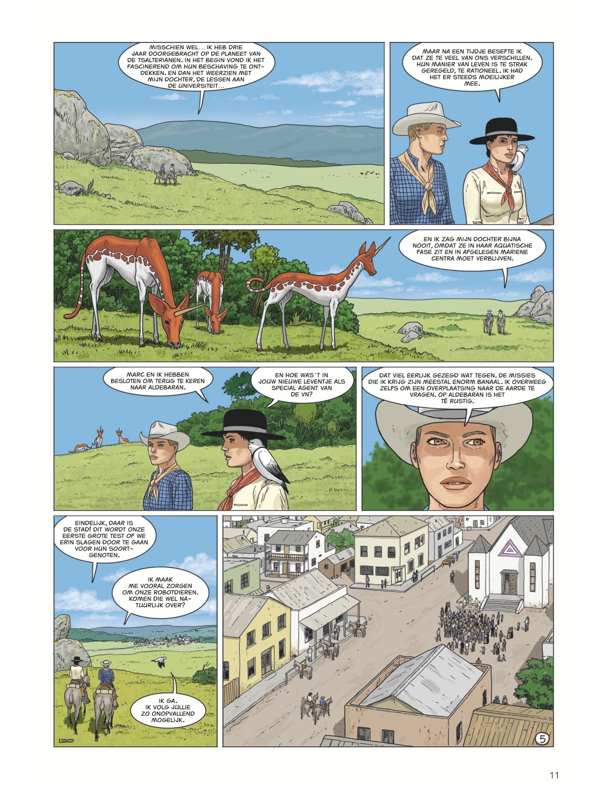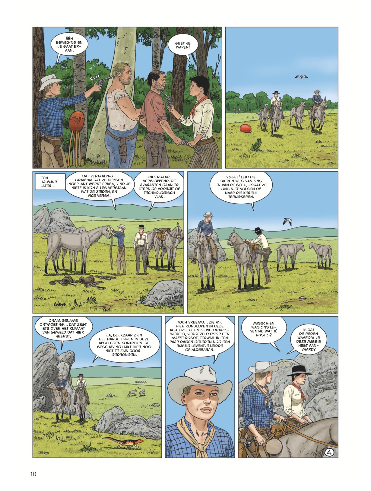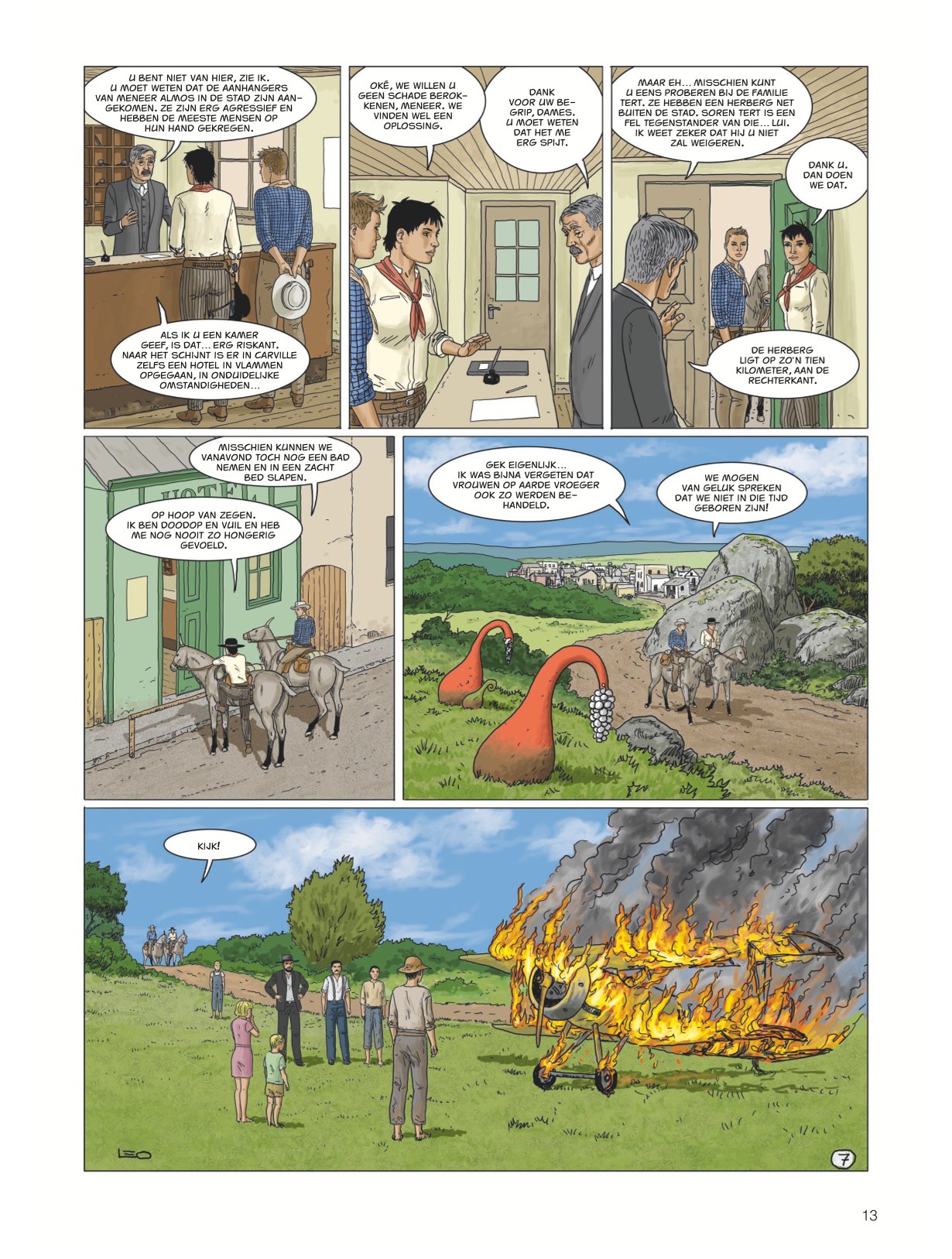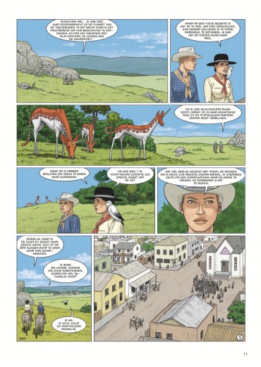 Score moyen 4 / 5Calamity Kim Kim en Manon in het Wilde Westen had ook de titel boven dit stukje kunnen zijn. Anders dan de vorige cycli valt deze zevende Aldebaran-cyclus met de deur in huis: Manon en Kim go West en zitten als stoere cowgirls op een paardachtig rijdier, rekenen deskundig af met een stel onbehouwen bullebakken en komen stapvoets aan in een frontierstadje... En toch is dit geen western, maar sciencefiction. Al is de combinatie — zeker audiovisueel — niet ongebruikelijk (denk Westworld, Cowboys vs Aliens of diverse vormen van steampunk). Ook voor Leo is de combi niet helemaal nieuw (denk Verre Werelden). Al ligt in deze reeks minder de nadruk op de verkenning van een nieuwe wereld, inhoudelijk past Bellatrix wel in Leo’s straatje: de aardse bewoners van deze planeet zijn in de greep van sektarische fanatici gevallen, die allerlei lelijke dingen zeggen over vrouwen, de vooruitgang en allicht ook over Conner Rousseau. Een thema dat hij ook al in Antares en Terug naar Aldebaran uitspeelde. In opdracht van de VN moeten Kim, onze heldin van het eerste uur en kenner van vele werelden, en Manon, die met haar al enkele avonturen heeft overleefd, een oppositieleidster gaan beschermen. Dat in samenwerking met de technologisch voorlijke Avaranten, een plots opgedoken volk uit een ander sterrenstelsel dat als een soort universumpolitie ook in onze Melkweg tragische gebeurtenissen (wil) vermijden". De extreemrechtse coup die dreigt op Bellatrix is er blijkbaar zo eentje. Deze ruimteflikken waren wel niet present toen de planeet werd getroffen door een calamiteit met een meteoriet die een volledig continent verwoestte, maar alla. Uiteraard draait een en ander algauw danig in de soep, wat wellicht voldoende stof voor de volgende episodes geeft. De retrosfeer van deze cyclus is weer eens wat anders, een leuke vondst. Leo is opnieuw sterk in het neerzetten van geloofwaardige personages en lijkt nog steeds beter te worden in gelaatsuitdrukkingen, maar blijft ze nog vaak een houterige mimiek geven (met te korte armen) en laat ze in decors lopen die soms wat uit verhouding (de deur van Kims hotel lijkt opeens zo groot als een garagepoort) of fout zijn (een gedekte tafel is dat opeens niet meer in het volgende plaatje). Dat is natuurlijk het risico van alles (scenario, tekeningen, inkleuring) alleen te doen. Toch is ook deze nieuwe vreemde wereld weer heerlijk vertrouwd terrein voor Leo-lezers, die zeker plezier zullen beleven aan de hachelijke situatie van Kim en Manon. Zelfs Bellatrix Lestrange laat via uilenpost weten fan te zijn. Van de slechteriken dan wel. KOEN DRIESSENS ssz"