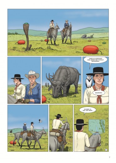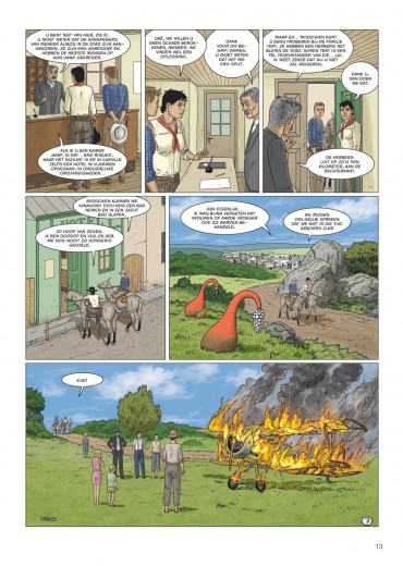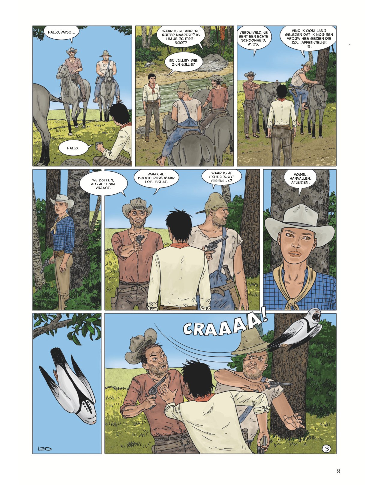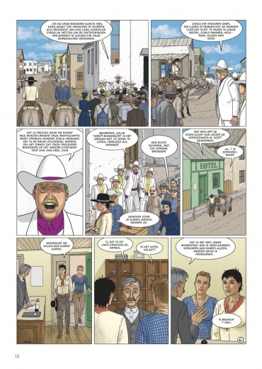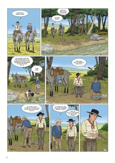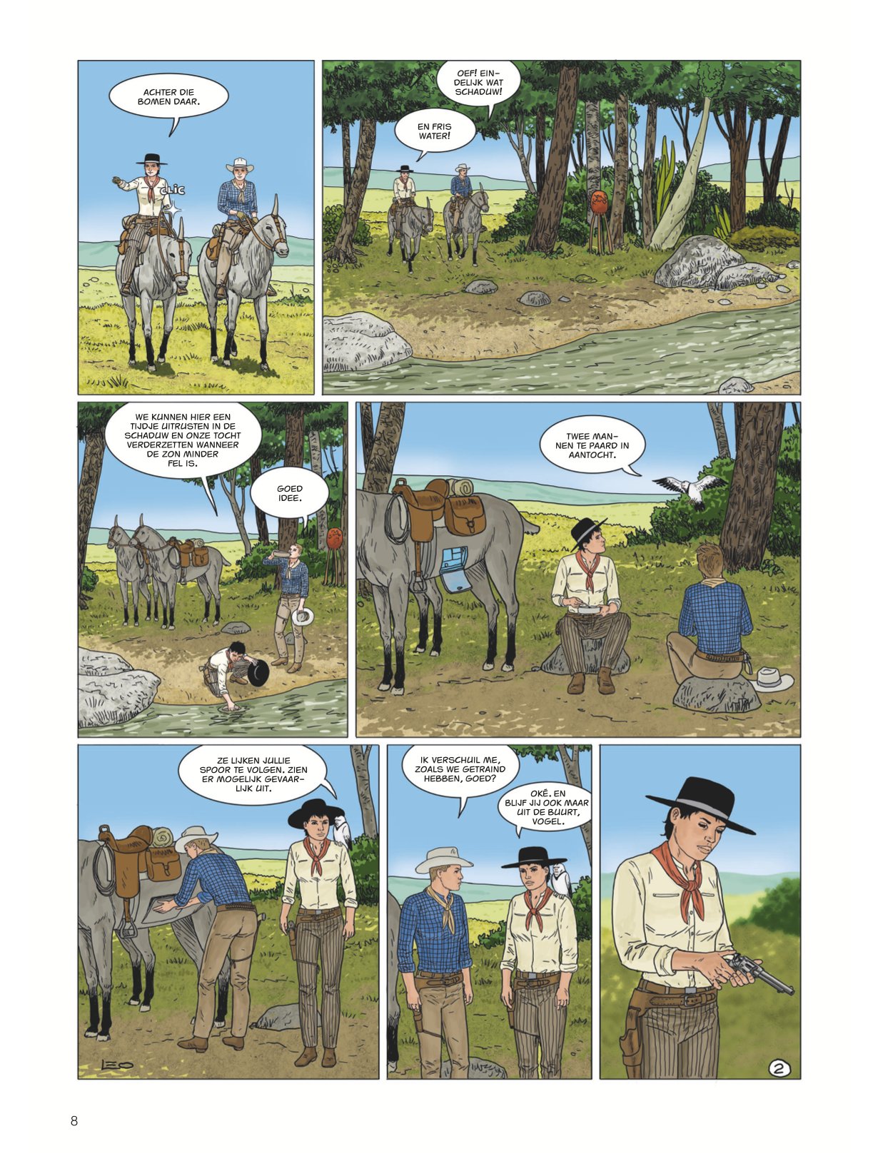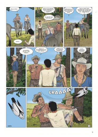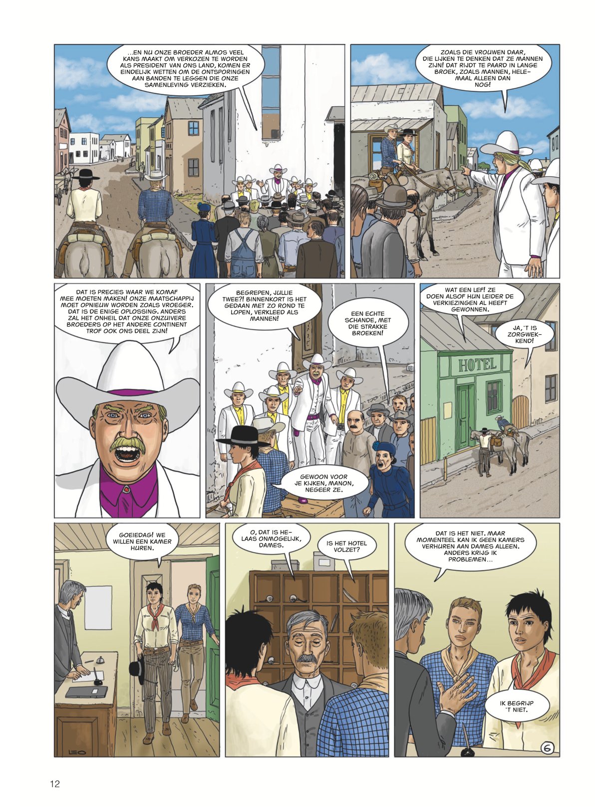 Score moyen 4 / 5Calamity Kim Kim en Manon in het Wilde Westen had ook de titel boven dit stukje kunnen zijn. Anders dan de vorige cycli valt deze zevende Aldebaran-cyclus met de deur in huis: Manon en Kim go West en zitten als stoere cowgirls op een paardachtig rijdier, rekenen deskundig af met een stel onbehouwen bullebakken en komen stapvoets aan in een frontierstadje... En toch is dit geen western, maar sciencefiction. Al is de combinatie — zeker audiovisueel — niet ongebruikelijk (denk Westworld, Cowboys vs Aliens of diverse vormen van steampunk). Ook voor Leo is de combi niet helemaal nieuw (denk Verre Werelden). Al ligt in deze reeks minder de nadruk op de verkenning van een nieuwe wereld, inhoudelijk past Bellatrix wel in Leo’s straatje: de aardse bewoners van deze planeet zijn in de greep van sektarische fanatici gevallen, die allerlei lelijke dingen zeggen over vrouwen, de vooruitgang en allicht ook over Conner Rousseau. Een thema dat hij ook al in Antares en Terug naar Aldebaran uitspeelde. In opdracht van de VN moeten Kim, onze heldin van het eerste uur en kenner van vele werelden, en Manon, die met haar al enkele avonturen heeft overleefd, een oppositieleidster gaan beschermen. Dat in samenwerking met de technologisch voorlijke Avaranten, een plots opgedoken volk uit een ander sterrenstelsel dat als een soort universumpolitie ook in onze Melkweg tragische gebeurtenissen (wil) vermijden". De extreemrechtse coup die dreigt op Bellatrix is er blijkbaar zo eentje. Deze ruimteflikken waren wel niet present toen de planeet werd getroffen door een calamiteit met een meteoriet die een volledig continent verwoestte, maar alla. Uiteraard draait een en ander algauw danig in de soep, wat wellicht voldoende stof voor de volgende episodes geeft. De retrosfeer van deze cyclus is weer eens wat anders, een leuke vondst. Leo is opnieuw sterk in het neerzetten van geloofwaardige personages en lijkt nog steeds beter te worden in gelaatsuitdrukkingen, maar blijft ze nog vaak een houterige mimiek geven (met te korte armen) en laat ze in decors lopen die soms wat uit verhouding (de deur van Kims hotel lijkt opeens zo groot als een garagepoort) of fout zijn (een gedekte tafel is dat opeens niet meer in het volgende plaatje). Dat is natuurlijk het risico van alles (scenario, tekeningen, inkleuring) alleen te doen. Toch is ook deze nieuwe vreemde wereld weer heerlijk vertrouwd terrein voor Leo-lezers, die zeker plezier zullen beleven aan de hachelijke situatie van Kim en Manon. Zelfs Bellatrix Lestrange laat via uilenpost weten fan te zijn. Van de slechteriken dan wel. KOEN DRIESSENS ssz"
