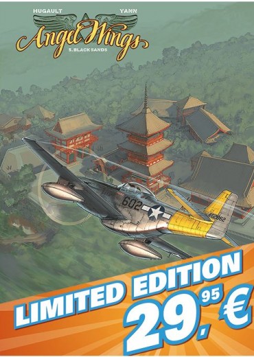 Verzamelaars en liefhebbers van het werk van Romain Hugault willen deze Luxe Editie absoluut niet missen! - Hardcover 'Angel Wings' deel 5 met andere covertekening - 1 Prachtige stand-up display van een vliegtuig - 1 Ex-libris - oplage 444 exemplaren, OP=OP! De kruiser die Angela McCloud en Betty Nutton vervoerde naar het eiland Tinian, waar die laatste een voorstelling moest geven, is getroffen door twee bakas, de gevreesde vliegende bommen, bestuurd door Japanse kamikazepiloten. De actrice, volledig door het dolle heen, wordt naar Hawaii gerepatrieerd en Angela, die blij is dat ze niet langer voor oppas moet spelen, aanvaardt maar wat graag de rol van Joséphine, pilote van een Mustang met opblaasbare reddingsboot, om te patrouilleren voor de kust van Iwo Jima, op zoek naar in zee rondzwalpende piloten. Op het eiland met zijn zwarte stranden treft de onverschrokken WASP haar oude liefje Rob aan, die de Burma Banshees heeft verlaten om B-29’s te escorteren die Japan bombarderen. Onze heldin blijft vastbesloten om het eiland Tinian te bereiken, waar ze duidelijkheid hoopt te vinden rond de moord op haar zus Maureen... Maar Iwo Jima is nog niet volledig heroverd: in het noorden van het eiland bieden de Japanners nog weerstand, en bereiden een grote kamikaze-aanval voor... Angel Wings is een Tweede Wereldoorlog-avontuur van topduo Yann en Romain Hugault (De Nachtuil, Edelweiss). Angel Wings is een Tweede Wereldoorlog-avontuur van topduo Yann en Romain Hugault (De Nachtuil, Edelweiss).