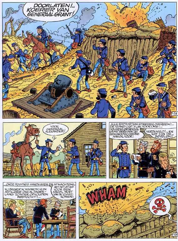 De reeks 'De Blauwbloezen' is een geslaagde mengeling van avontuur en humor. Cauvin gebruikt - zoals hij wel meer doet - historische anekdotes uit de Amerikaanse burgeroorlog om ons hilarische verhalen te vertellen over de perikelen in het leger, waar de hoogste officieren niet per se de slimste zijn... Willy Lambil heeft zich uitstekend gedocumenteerd en maakt van zijn pagina's heldere, intelligente kunstwerkjes. Het resultaat is amusement op hoog niveau, dat door een nog steeds groeiend publiek wordt gewaardeerd.
