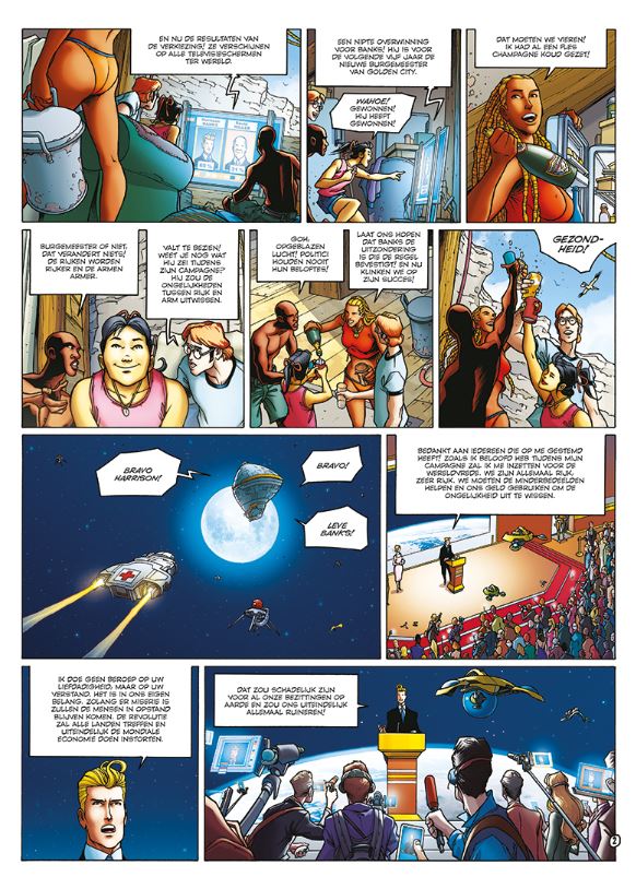 Dit voordeelpakket is voor de echte verzamelaar! Het pakket bevat Golden City 13 en het 96 pagina's dikke artbook Blue Adventures, beiden getekend door Nicolas Malfin. Striptekenaar van deze reeks is Malfin Nicolas ( Frankrijk,°1971) en tekende ook de reeksen Blue Adventures Cézembre Golden City Meteen na zijn aantreden als burgemeester van Golden City wordt Harrison Banks het slachtoffer van een lastercampagne met als doel zijn imago te schaden. De miljardair zal enkele extreem hachelijke situaties het hoofd moeten bieden. Mevrouw Banks vreest voor het leven van haar zoon en huurt Amber in om over Harrison te waken. Amber wordt de geliefde van Banks en kan zo haar missie nog beter vervullen. Als Harrison naar Rusland moet om de naam van de Groep Banks te zuiveren gaat Amber mee. Samen moeten ze de lokale maffia te trotseren. Intussen tast een duistere geschiedenis van organenhandel de reputatie van de jonge burgemeester verder aan.