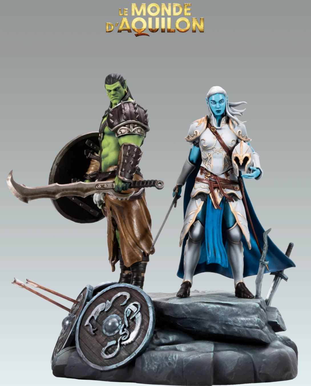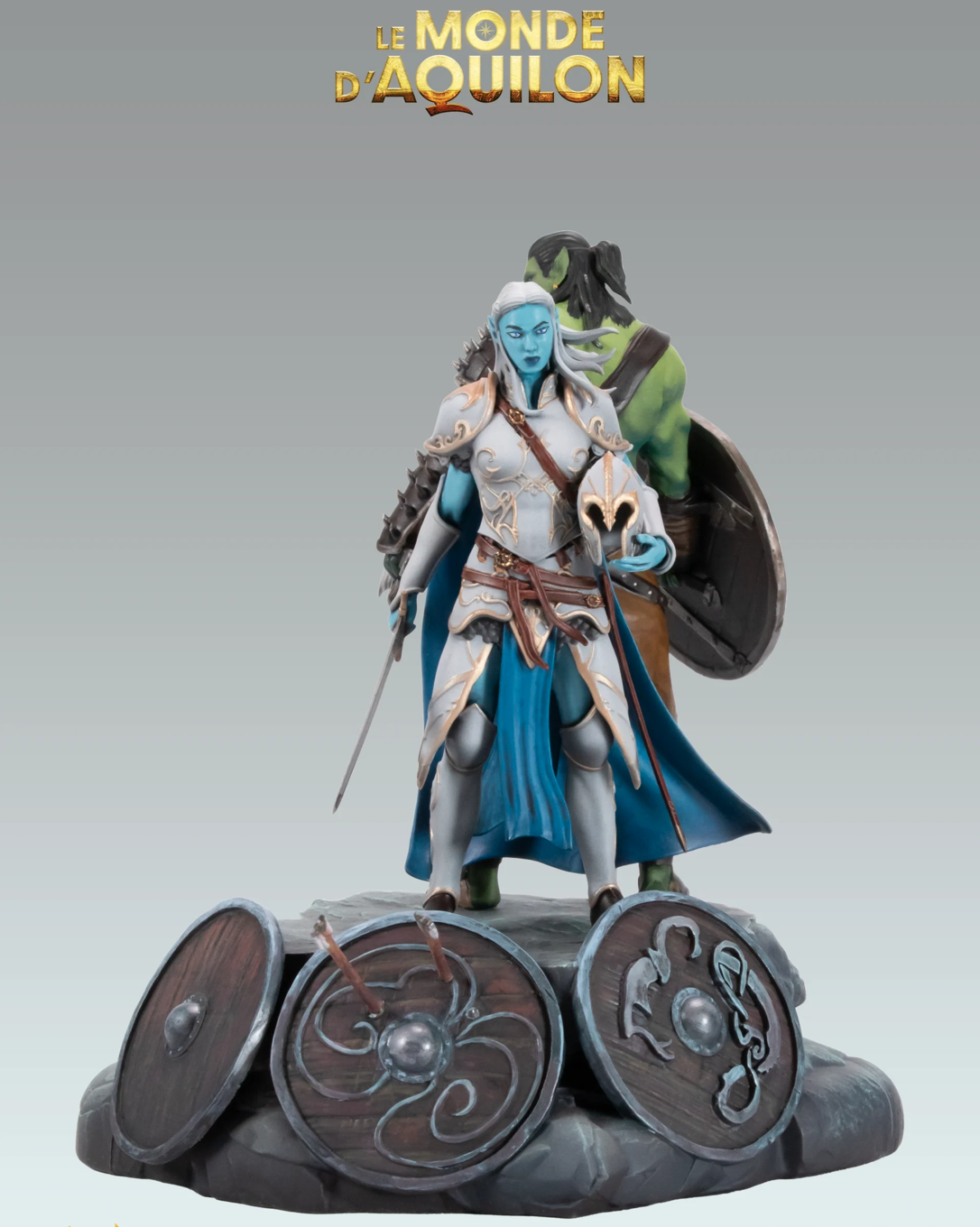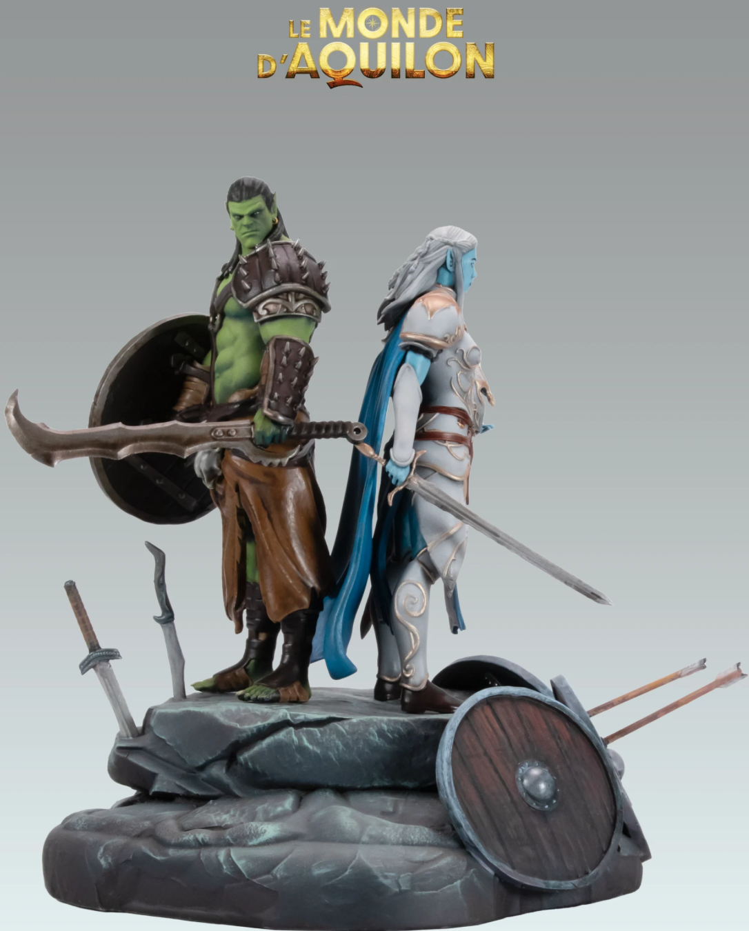 Figurines de collection en résine de Turuk ‘Bouclier’ & Lanawyn sur leur socle décor.