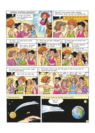 De vrouwen van planeet Xaverius zijn het gedrag van hun mannen, die allemaal op Xavier Waterslaeghers lijken, grondig beu. Luieren, slapen en in de kroeg hangen om te drinken is het enige dat ze doen. Ze besluiten de hulp in te roepen van Carmen, om hun onwillige mannen een lesje te leren. Een groepje vrouwen vliegt met een vliegende schotel naar de aarde om Carmen op te halen. Eenmaal op de planeet Xaverius, krijgt Carmen te horen wat haar opdracht is. Dat ziet ze wel zitten. De epigonen van Xavier in de pas leren lopen ligt haar wel. Maar intussen, op aarde, stellen Xavier en zijn vrienden vast dat Carmen spoorloos verdwenen is. Ook Neroke is weg. Ze beginnen een wanhopige zoektocht, maar die levert niks op...