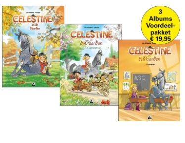 Promopakket met deel 1, 2 en 3 Mijn naam is Celestine. Ik ben 10 jaar en ... mijn passie is paarden zoals je al wel verwacht had. Maar geloof me, dat is niet altijd het geval geweest. Toen ik vroeger klein was en ik langs manege ’De vier hoefijzers’ liep vond ik ze niet eens mooi. Ze kregen het zelfs voor elkaar om me in mijn neus te bijten! Tot ik op een dag Salar leerde kennen. Hij werd mijn beste vriend en ik de zijne. Nu galoppeer ik niet meer op hem, maar ik vlieg gewoon… Het scenario van Lili Mésange voert ons mee naar de wereld van de maneges waar werkelijk alles kan. Een vrije en onbevangen wereld waar paard en ruiter een zijn met de natuur. Maar waar ook de onhebbelijkheden van de dieren, hun begeleiders en het werk van de medewerkers in de manege op een kolderieke manier uitvergroot wordt. Wat tot dolkomische situaties kan leiden. De tekeningen van Stefano Turconi zijn soepel en dynamisch uitgevoerd, passen perfect bij het humoristische scenario. De decors of beter gezegd het gebrek aan decor maakt dat de lezer zich focust op het verhaal. Zoals eenieder kan opmaken uit de pagina links, is deze strip gericht op een breed publiek. Niet alleen het jonge volkje, maar ook hun ouders en grootouders kunnen genieten van dit grappig tussendoortje. Stripinfo.be