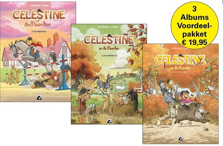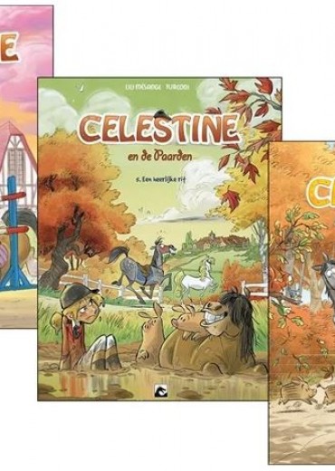 Promopakket met deel 4, 5 en 8 Mijn naam is Celestine. Ik ben 10 jaar en ... mijn passie is paarden zoals je al wel verwacht had. Maar geloof me, dat is niet altijd het geval geweest. Toen ik vroeger klein was en ik langs manege ’De vier hoefijzers’ liep vond ik ze niet eens mooi. Ze kregen het zelfs voor elkaar om me in mijn neus te bijten! Tot ik op een dag Salar leerde kennen. Hij werd mijn beste vriend en ik de zijne. Nu galoppeer ik niet meer op hem, maar ik vlieg gewoon… Het scenario van Lili Mésange voert ons mee naar de wereld van de maneges waar werkelijk alles kan. Een vrije en onbevangen wereld waar paard en ruiter een zijn met de natuur. Maar waar ook de onhebbelijkheden van de dieren, hun begeleiders en het werk van de medewerkers in de manege op een kolderieke manier uitvergroot wordt. Wat tot dolkomische situaties kan leiden. De tekeningen van Stefano Turconi zijn soepel en dynamisch uitgevoerd, passen perfect bij het humoristische scenario. De decors of beter gezegd het gebrek aan decor maakt dat de lezer zich focust op het verhaal. Zoals eenieder kan opmaken uit de pagina links, is deze strip gericht op een breed publiek. Niet alleen het jonge volkje, maar ook hun ouders en grootouders kunnen genieten van dit grappig tussendoortje. Stripinfo.be