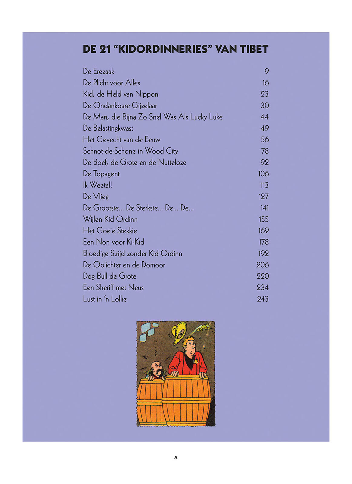 met dossier Deze 256 pagina's dikke integrale bundelt alle Kidordinneries, komische kortere verhalen met Kid Ordinn in een glansrol, waarvan er één verhaal nooit in album is verschenen. Het dossier gaat dieper in op deze Kidordinneries. Hierna verschijnen nog twee integrales. In deel 14 zullen niet eerder in het Nederlands verschenen verhalen staan. In deel 0 zullen de prille verhalen samengebracht worden waarin de personages nog dieren waren. 'Wood City zou een stadje zonder verhalen zijn, mochten haar sheriff Dog Bull en diens adjudant Kid Ordinn er niet geweest zijn. Dog Bull is impulsief, ijdel, ontzettend te kwader trouw. hij misbruikt vaak de macht die zijn ster met zich meebrengt. Volstrekt toegewijd aan zijn baas, is Kid Ordinn aandoenlijk naïef en een onverbeterlijke klungelaar. Er is geen groter verschil tussen hen beiden, maar de een kan niet zonder de ander. Het succes van hun waanzinnige gekibbel bracht Tibet er regelmatig toe hen op te voeren in middellange verhalen. De twee onafscheidelijke vrienden van Chick Bill zijn zelf de hoofdrolspelers in deze “Kidordinneries” geworden. In deze hilarische integrale zijn ze alle verzameld.' Integraal Publicatie: 2022, deel 13 van vijftiendelige reeks Uitgeverij: Saga Uitgaven Pagina's en uitvoering: 256, hardcover Dossier: 6 pagina's. Dossiertje over de Kidordinneries, komische kortere verhalen die Tibet grotendeels zelf schreef met hulpsheriff Kid Ordinn in een meestal grotere rol. Het toneelgehalte van deze verhalen wordt wat toegelicht. Oorspronkelijke albumcovers: Geen. De korte verhalen verschenen allemaal als extra vullers met andere verhalen in verscheidene albums doorheen de reeks. Compleet: Alle verhalen in chronologische volgorde. In de loop van de jaren tekende Tibet nog andere korte verhalen en gelegenheids- of reclamegags van Chick Bill die in de laatste integrale verzameld zullen worden. Gebundelde verhalen* De Erezaak (7 pagina's uit 1967, opgenomen in Chick Bill deel 38) De Plicht voor Alles (7 pagina's uit 1967, opgenomen in Chick Bill deel 38) Kid, de Held van Nippon (7 pagina's uit 1967, opgenomen in Chick Bill deel 47) De Ondankbare Gijzelaar (14 pagina's uit 1973, opgenomen in Chick Bill deel 36) De Man, die Bijna Zo Snel Was Als Lucky Luke (5 pagina's uit 1973, opgenomen in Chick Bill deel 50) De Belastingkwast (7 pagina's uit 1974, opgenomen in Chick Bill deel 45) Het Gevecht van de Eeuw (22 pagina's uit 1975, opgenomen in Chick Bill deel 37) Schnot-de-Schone in Wood City (14 pagina's uit 1976, opgenomen in Chick Bill deel 40) De Boef, de Grote en de Nutteloze (14 pagina's uit 1976-1977, opgenomen in Chick Bill deel 41) De Topagent (7 pagina's uit 1978, opgenomen in Chick Bill deel 45) Ik Weetal! (14 pagina's uit 1978, opgenomen in Chick Bill deel 44) De Vlieg (14 pagina's uit 1980, opgenomen in Chick Bill deel 46) De Grootste... De Sterkste... De... De... (14 pagina's uit 1981, opgenomen in Chick Bill deel 48) Wijlen Kid Ordinn (14 pagina's uit 1982, opgenomen in Chick Bill deel 49) Het Goeie Stekkie (9 pagina's uit 1982, opgenomen in Chick Bill deel 50) Een Non voor Ki-Kid (14 pagina's uit 1983, opgenomen in Chick Bill deel 51) Bloedige Strijd zonder Kid Ordinn (14 pagina's uit 1984, opgenomen in Chick Bill deel 52) De Oplichter en de Domoor (14 pagina's uit 1984, opgenomen in Chick Bill deel 53) Dog Bull de Grote (14 pagina's uit 1985, opgenomen in Chick Bill deel 55) Een Sheriff met Neus (9 pagina's uit 1981, opgenomen in Chick Bill deel 47) Lust in ’n Lollie (14 pagina's uit 1986, opgenomen in Rik Ringers: Een Brief voor Baardemakers / De Avonturen van Chick Bill: Lust in 'n Lollie, collectie Philastrips) * De jaartallen zijn die van de eerste publicatie in Kuifje en Super Kuifje.