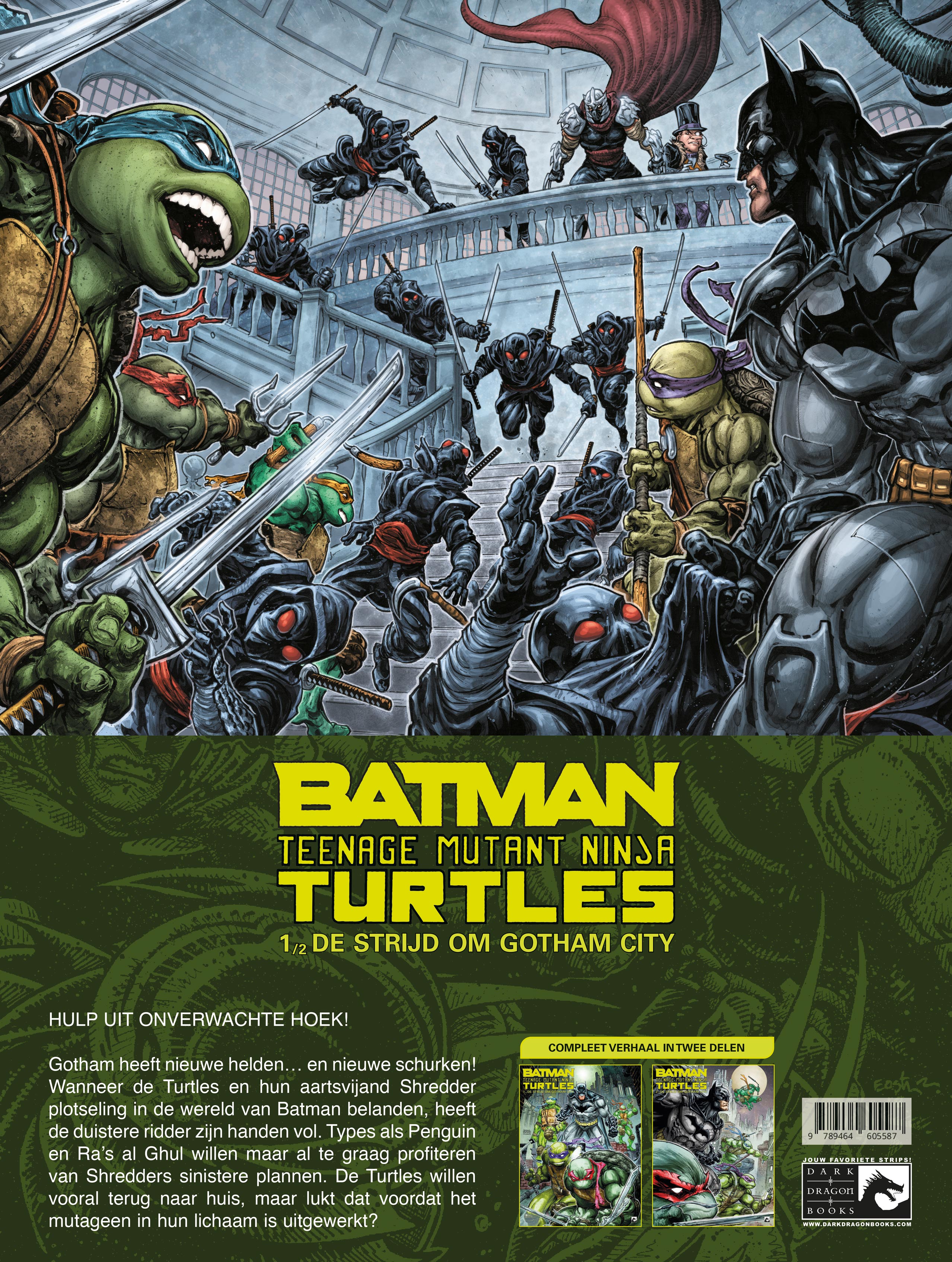 18/06/2024 Succes verzekerd wanneer het universum van TMNT en dat van Batman samenkomen in 1 nieuwe reeks. Er verschijnen in totaal 3 gelijknamige tweeluiken. Dit is de eerste. Ook geschikt voor jongere lezers. Batman heeft al genoeg aan zijn hoofd met het beschermen van Gotham. Maar als de nieuwe vijand Shredder opduikt, krijgt Batman hulp van de Turtles! Batman/TMNT: Strijd om Gotham City 1 (van 2)