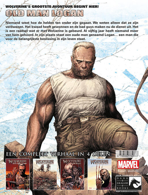 Herziene editie ( maw een nieuwe omslag) Compleet verhaal in 4 delen 4 x Softcover 4 x 48 blz. Mark Millar en Steve MvNiven de makers van de mega-hit 'Civil War', vertellen één van de meest opzienbarende verhalen in de geschiedenis van Wolverine. WOLVERINE’S GROOTSTE AVONTUUR BEGINT HIER! Niemand weet hoe de helden ten onder zijn gegaan. We weten alleen dat ze zijn verdwenen. Het kwaad heeft gewonnen en de bad guys maken nu de dienst uit. Het is een raadsel wat er met Wolverine is gebeurd. Al vijftig jaar heeft niemand meer van hem gehoord. In zijn plaats staat een oude man genaamd Logan... een man die voor de belangrijkste beslissing in zijn leven staat.