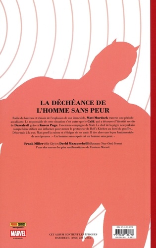 Radié du barreau et témoin de l'explosion de son immeuble, Matt Murdock traverse une période accablante. Le responsable de celte situation n'est autre que la Caïd, qu ia découvert l'identité secrète de Daredevil grâce à Karen Page, l'ancienne compagne de Matt. Le chef de le pègre new-yorkaise compte bien utiliser son influence pour mener le protecteur de Hell's Kitchen au bord du gouffre... Désormais à la rue, Malt perd la raison et s'éloigne de ses amis. Il tire alors une leçon fondamentale de ces épreuves : " Un homme sans espoir est un homme sans peur. . Frank Miller (Sin City) et David Maraneehelli (Serinai. Yser One) livrent l'une des maures les plus emblématiques de l'univers Marvel.