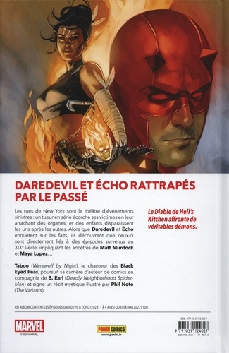 Une version sanguinaire et démoniaque du Bouffon Vert kidnappe des enfants afin de réveiller un ancien mal dans les entrailles de New York. Daredevil et Echo, enfin réunis, vont devoir s'allier pour sauver tous les habitants de la ville ! Après la série Disney+ consacrée à Echo et avant le lancement de celle dédiée à Daredevil, cette mini-série réunit les deux héros, juste à temps pour les 60 ans de Matt Murdock ! Une saga complète dans laquelle Maya Lopez est temporairement débarrassée des pouvoirs du Phénix, qu'elle maniait récemment dans Avengers.