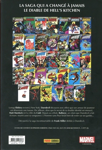 Le Caïd et Bullseye ont décidé de frapper Daredevil en plein coeur, en lui prenant tout ce qui lui est cher. Elektra, Stick et la Main font leurs premières apparitions et le journaliste Ben Urich plonge dans les ténèbres qui entourent Matt Murdock. Les Avengers et d'autres héros Marvel sont de la partie. La carrière du Diable rouge est jalonnée de nombreux moments forts, mais le passage de Frank Miller sur la série Daredevil a sans aucun doute marqué son histoire de manière indélébile. C'est d'ailleurs cette période qui a largement inspiré la série Netflix désormais visible sur Disney+. Ce gigantesque album réunit plus de trente épisodes de cette époque mythique dans une superbe édition.