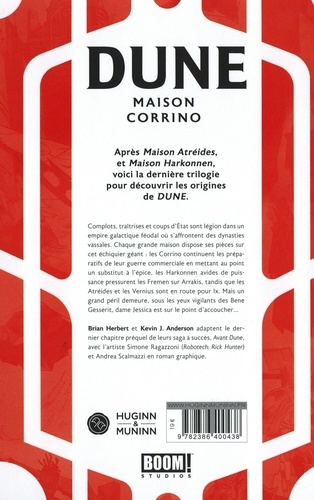 Après Maison Atréides, et Maison Harkonnen, voici la dernière trilogie pour découvrir les origines de DUNE. Complots, traîtrises et coups d'Etats sont légion dans un empire galactique féodal où s'affrontent des dynasties vassales. Chaque grande maison dispose ses pièces sur cet échiquier géant : les Corrino continuent les préparatifs de leur guerre commerciale en mettant au point un substitut à l'épice, les Harkonnen avides de puissance pressurent les Fremen sur Arrakis, tandis que les Atréides et les Vernius sont en route pour Ix. Mais un grand péril demeure, sous les yeux vigilants des Bene Gesserit, dame Jessica est sur le point d'accoucher... Brian Herbert et Kevin J. Anderson, adaptent le dernier chapitre préquel de leur saga à succès, Avant Dune, avec l'artiste Simone Ragazzoni (Robotech : Rick Hunter) et Andrea Scalmazzi en roman graphique.