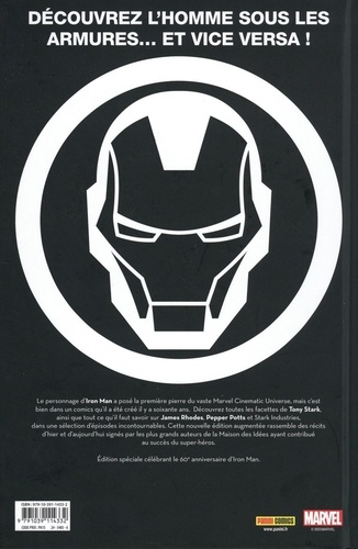 L'un des plus grands visionnaires de l'univers Marvel est mis à l'honneur avec une foule d'histoires retraçant la carrière de Tony Stark, alias Iron Man, à l'occasion des soixante ans du personnage. Des origines à ses aventures les plus récentes, du Tony Stark alcoolique au Tony Stark chef du S. H. I. E. L. D. , retrouvez les plus grands moments de la longue saga d'Iron Man. Pour les 60 ans du héros, nous vous proposons une nouvelle édition de cet album anthologique auquel nous avons ajouté le premier épisode de la série de 2018. Iron Man est l'un des personnages emblématiques de l'univers Marvel, et le héraut de l'âge du Marvel Cinematic Universe.