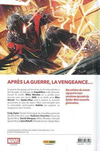 Après la guerre, la vengeance... La guerre des gangs est terminée. La loi anti-justiciers a été abrogée, et l'équipe de Capekillers a été dissoute. Durant le conflit, Miles Morales en a profité pour renouer avec son clone, Shift, et sa vieille amie Miss Marvel. Pour Spider-Man, c'est à présent le moment de prendre un peu de repos ! Mais c'est compter sans la redoutable technopathe Rabble qui prépare sa vengeance dans l'ombre...