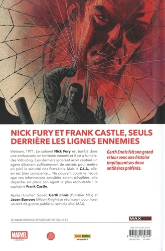 Vietnam, 1971. Le colonel Nick Fury est tombé dans une embuscade en territoire ennemi et il est à la merci des Viét-công. Ces derniers ignorent avoir capturé un agent détenant suffisamment de secrets pour mettre en péril la sécurité des Etats-Unis. Mais la C.I.A., elle, en est bien consciente... Ne pouvant courir le risque que ces informations sensibles soient dévoilées, elle dépêche sur place son agent le plus redoutable : le capitaine Frank Castle. Après Punisher : Soviet, Garth Ennis (Punisher Max) et Jacen Burrows (Moon Knight) se réunissent pour livrer un récit de guerre publié au sein du label MAX.