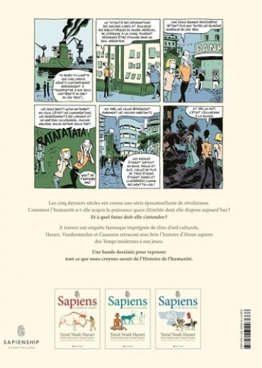 Les cinq derniers siècles ont connu une série époustouflante de révolutions. Comment l'humanité a-t-elle acquis la puissance quasi illimitée dont elle dispose aujourd'hui ? Et à quel futur doit-elle s'attendre ? A travers une enquête fantasque imprégnée de clins d'oeil culturels, Harari, Vandermeulen et Casanave retracent avec brio l'histoire d'Homo sapiens des Temps modernes à nos jours. Une bande dessinée pour repenser tout ce que nous croyons savoir de l'Histoire de l'humanité.