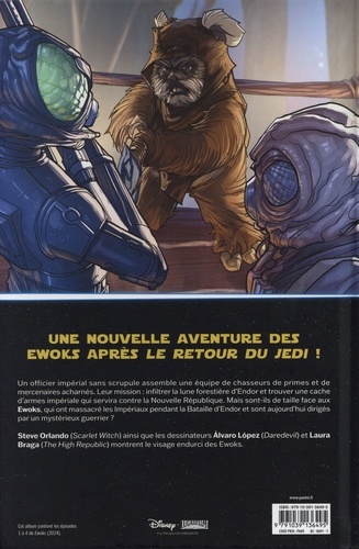Les stars du Retour du Jedi, les bien-aimés Ewoks, reviennent pour une toute nouvelle aventure ! Une équipe de chasseurs de primes dirigée par l'Empire arrive sur la lune forestière d'Endor à la recherche d'une cache secrète d'armes mortelles ! Mais sont-ils prêts à affronter des Ewoks déterminés, qui ont déjà éliminé un grand nombre d'impériaux ? Et qui est ce mystérieux nouveau guerrier Ewok qui revient au village de Bright Tree, et quel est son lien avec Wicket ? Ce récit inédit nous révèle ce qu'il advient des Ewoks après les événements du Retour du Jedi. Cette mini-série a été publiée aux Etats-Unis pour célébrer le quarantième anniversaire du téléfilm L'aventure des Ewoks : La caravane du Courage sorti en 1984. Il a été diffusé dans les salles françaises en 1985.