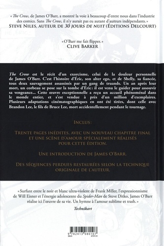 The Crow est le récit d'un exorcisme, celui de la douleur personnelle de James O'Barr. C'est l'histoire d'Eric, son alter ego, et de Shelly, sa fiancée, tous deux sauvagement assassinés par un gang de truands. Un an après leur mort, un corbeau se pose sur la tombe d'Eric : il est venu le guider pour assouvir sa vengeance... Cette oeuvre exceptionnelle a reçu un accueil phénoménal dans le monde entier, et s'est vendue à près d'un million d'exemplaires. Plusieurs adaptations cinématographiques en ont été tirées, dont celle avec Brandon Lee, le fils de Bruce Lee, mort accidentellement pendant le tournage.