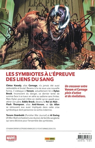 LES SYMBIOTES A L'EPREUVE DES LIENS DU SANG. Cletus Kasady, alias Carnage, n'a jamais été aussi redoutable et brutal. Revenu à la vie sous une nouvelle forme, il s'attaque à Venom, actuellement lié à Dylan Brock. Inconscient du danger, ce dernier tente de survivre face à ce tueur en série au sadisme sans limites. Mais Dylan pourrait n'être en réalité qu'un appât pour attirer son père, Eddie Brock, devenu le Roi en Noir... Flash Thompson, alias Anti-Venom, et Liz Allan se retrouvent eux aussi impliqués dans cette crise symbiotique dont personne ne sortira indemne. Un Torunn Grenbekk (Punisher War Journal) et Al Ewing (X-Men Red) orchestrent une réunion de famille sanglante qui sera décisive pour l'ensemble des symbiotes. Un crossover entre Venom et Carnage plein d'action et de révélations. CET ALBUM CONTIENT LES EPISODES VENOM (2021) 31 A 34 ET CARNAGE (2024) 5 A 8.