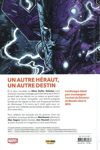 Un autre héraut, un autre destin. Et si, pour succéder au Silver Surfer, Galactus avait choisi son nouveau messager parmi les héros de la Terre ? Aurait-il jeté son dévolu sur un voleur au grand coeur, un titan à la force incroyable, une femme-araignée hantée par les regrets ou bien une fougueuse fermière du Mississippi ? A moins qu'il n'eût opté pour un guerrier aux multiples personnalités et déjà au service d'un autre dieu... pour accompagner Pour célébrer les soixante ans du premier vilain du panthéon cosmique de Marvel, Mat Groom (Ultraman), Alex Segura (Spider-Society), Ann Nocenti (Daredevil) et bien d'autres lui imaginent un tout autre héraut.