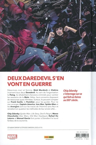 Elektra et Matt Murdock ont enfin atteint un certain équilibre, mais la dangereuse anti-héroïne se retrouve au centre d'un incident international qui menace tout ce qu'ils ont bâti ensemble ! Ils pourraient même devoir affronter les Avengers... mais c'est surtout la menace du Punisher qui plane sur eux ! Avec son long séjour sur la série qui a apporté son lot de rebondissements (comme l'incarcération de Matt Murdock et l'apparition d'Elektra sous le costume de Daredevil), Chip Zdarsky signe une période essentielle d'un personnage qui a toujours beaucoup inspiré les scénaristes ! Cet album fait par ailleurs entrer la série en collision avec le Punisher, tel que le présente Jason Aaron dans les récents volumes 100% MARVEL.