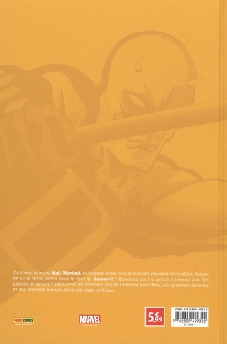 Revivez les débuts de Daredevil, lorsque Matt Murdock découvre ses pouvoirs et porte son costume jaune et noir. De la mort de son père Battlin' Jack Murdock à son affrontement avec le redoutable Homme Pourpre, en passant par sa rencontre avec la belle Karen Page, c'est une nouvelle vision des origines du justicier aveugle qui vous sont proposées Le tandem Jeph Loeb / Tim Sale signe le dernier tome la collection qu'ils ont inaugurée avec Spider-Man bleu, en mettant à l'honneur un autre des héros majeurs de Marvel. Une oeuvre marquante proposée en album indépendant pour la première fois depuis près de vingt ans.