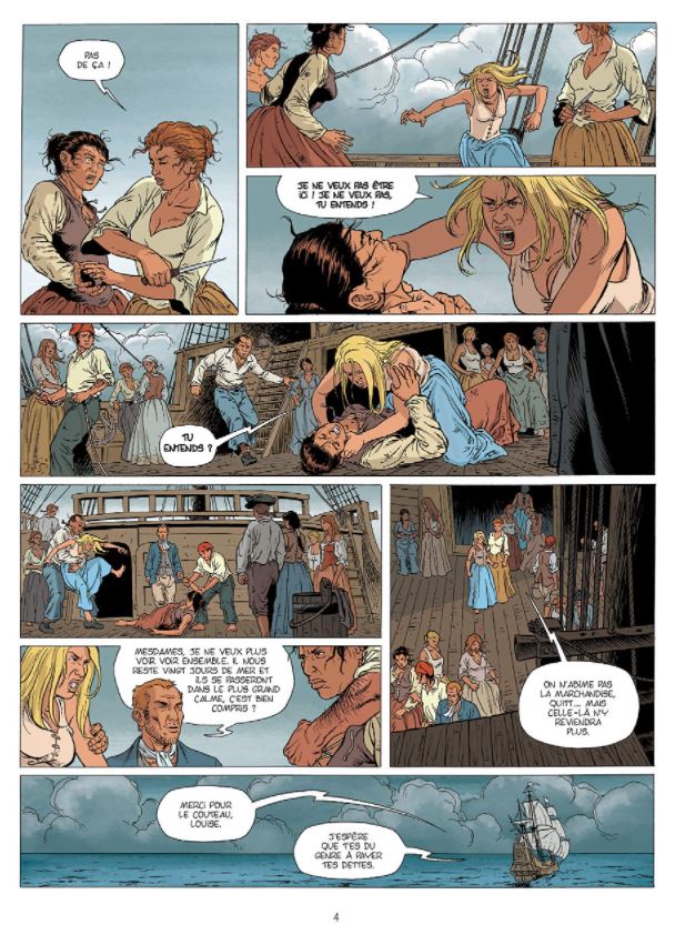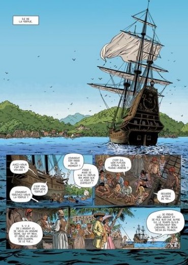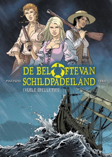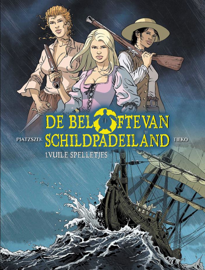 Voor alle duidelijkheid, dit verhaal staat los van het album ‘Strijd om Schildpadeiland’ uit de reeks ‘Roodbaard’. In tegenstelling tot Roodbaard zijn het hier 3 dames Quitt(erie), Apolline en Louise die de hoofdrol opeisen. Door hun achtergrond zijn het echter dames met een plan. In 1642 maken ze deel uit van een groep vrouwen die overgeplaatst worden van Frankrijk naar Schildpadeiland. Daar heeft gouverneur Levasseur van het eiland net een overwinning behaald op de Engelsen waardoor het eiland terug in Franse handen is. De vrouwen zijn van nut om de vrijbuiters te kalmeren en een permanente bevolking op het eiland te vestigen. De 3 dames vallen tijdens de overtocht tijdens een storm van het schip waarbij ze elkaar beloven dat ze elkaar nooit in de steek zullen laten. Eens ze op het eiland komen, worden de dames gesplitst en komen ze bij 3 verschillende mannen terecht. Dit zorgt voor conflicten tussen de dames onderling waardoor de belofte al snel op de helling komt te staan. Intussen is er ook dreiging van Spaanse vloten die een oog hebben laten vallen op het eiland. Of komt er dreiging van interne Franse kant, of toch nog van de Engelsen die het eiland willen heroveren..? ‘Vuile spelletjes’ is wat het belooft. De 3 vrouwen passen zich aan bij de mannen, maar in hun achterhoofd blijven ze werken aan een plan om te kunnen ontsnappen van het eiland. Vooral voor Quitt is dit belangrijk, gezien haar zoontje en moeder in Frankrijk achtergebleven zijn. Zij heeft dan weer het geluk de vrouw te worden van de gouverneur, waardoor ze van zijn invloed kan profiteren. Louise is dan weer een vrouw met ballen en laat van haar horen, wat dikwijls tot grappige situaties leidt. Zij raakt dan weer verliefd op haar nieuwe man. Tenslotte vecht Apolline tegen de dood op het eiland nadat ze koorts maakt na een aanvaring op het schip. Uiteindelijk weet ze zich te redden door de hulp van een indiaan en wordt ze een echte scherpschutter. Een ideaal samenspel van omstandigheden dus om hun plan verder uit te werken… Stripscenarist Piatzszek Stéphane (De eenhoornridder, Een familie in oorlog,…) weet ons te boeien met een scenario die goed in elkaar zit en en legt een mooie basis voor een verder vervolg. Ook de tekeningen door Tieko (Hindenburg, Tomoe,…) weten te bekoren. Alles is mooi uitgewerkt zonder te veel details waardoor de focus eerder op de personages en het verhaal komt te liggen. Zal het Quitt, Apolline en Louise lukken om Frankrijk terug te bereiken of wacht hen een ander lot ? We zijn benieuwd naar meer !
