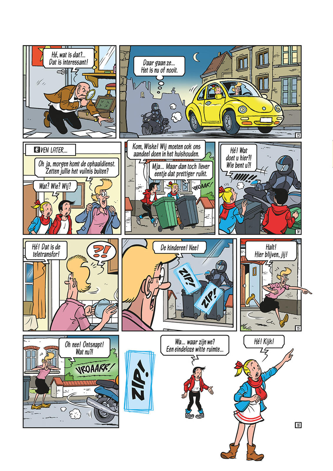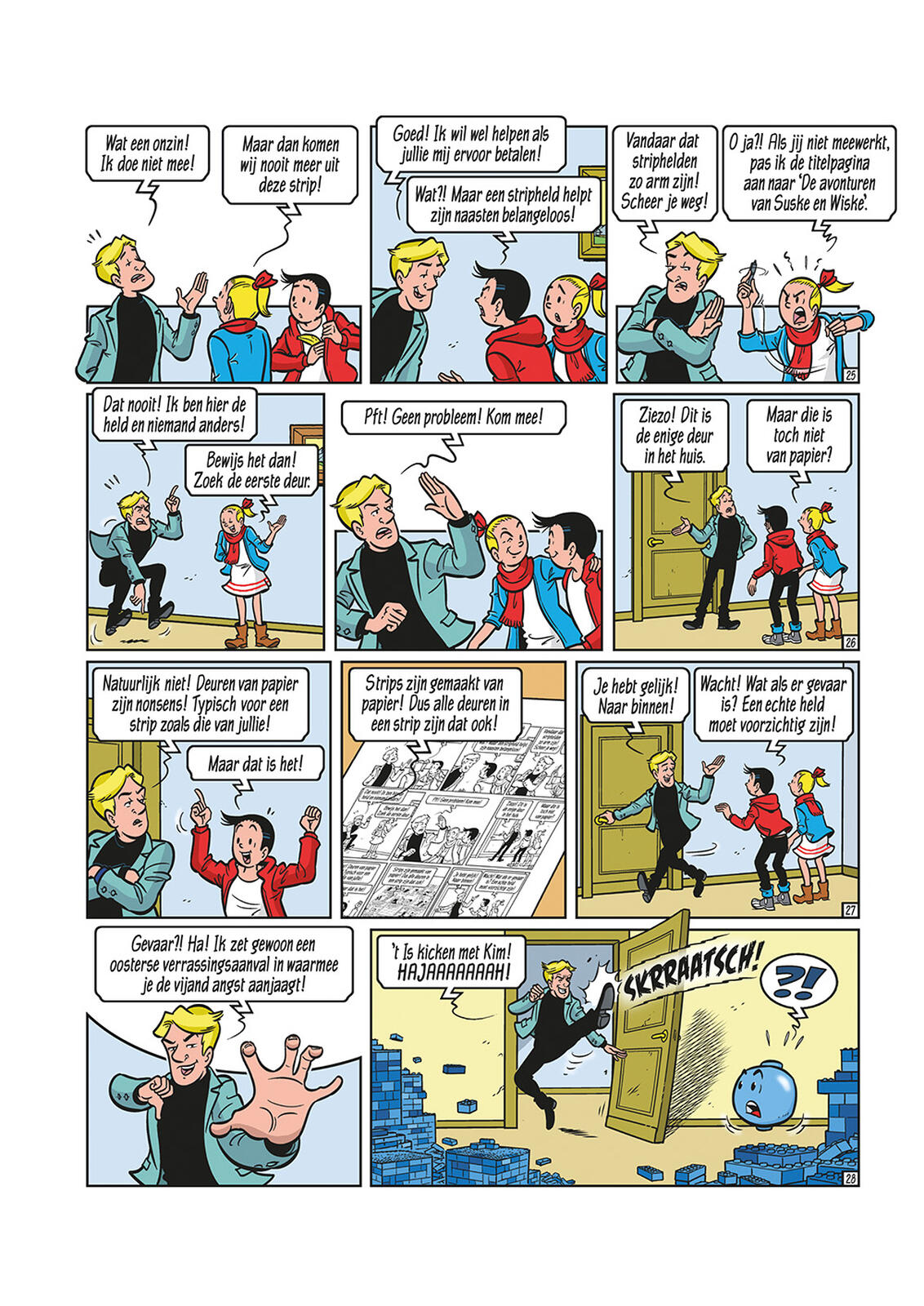 Après que le télétransfor du professeur Barabas ait été volé, un mystérieux motard téléporte Suske et Wiske dans l'album d'un dessinateur inconnu. Il devient vite évident que leur mission est d'aider le personnage principal de cet album, un certain Kim Kicken, à devenir un véritable héros de bande dessinée. S'ils échouent, ils resteront à jamais piégés dans cet album. Pendant ce temps, Sidonie et Lambique tentent de découvrir où se trouvent Suske et Wiske en recherchant le voleur du télétransfor. Mais le temps presse, car l'histoire est remplie de situations aussi dangereuses que farfelues, et Suske et Wiske ont beaucoup de mal à garder le héros de bande dessinée Kim sous contrôle, tout en essayant de ne pas y laisser leur peau.