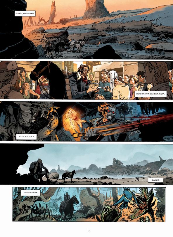 de eerste twee delen van dit drieluik! van de tekenaar van 1. De Nieuwe avonturen van Bob Morane 2. Angor 3. Sykes 4. Texas Jack van de scenarist van 1. Arale 2. Goblins 3. Hedge Fund 4. Het Testament van Kapitein Crown 5. Irons 6. Rum Erfgoed Dimitri Armand, de man achter het succes van Sykes en Texas Jack, twee strips verschenen in de collectie Getekend ( Le Lombard) verrast ons dit jaar met een nieuwe strip “ Le Convoyeur “ vrij vertaald de Bijrijder. Een post-apocalyptische strip, geschreven door Roulot ( Irons, Hedge Fund, Rum Erfgoed,…) Het verhaal over een verdorven militair avonturier met rode ogen, die alle opdrachten wil vervullen op één voorwaarde : dat je bereidt bent om… zijn ei dat hij je geeft, op te eten! Spannende avonturen waarbij hij achterna gezeten wordt door een mysterieuze vrouw in een wereld die bedreigt wordt door ROEST die alle metaal aantast. Voorzien in een drieluik maar zoveel ideeën zijn erbij gekomen dat een meerder delen bijna een logisch gevolg zal zijn. Dimitri Armand ( Frankrijk, °1982 ) Een beetje dankzij Marini of moeten we zeggen door de invloed van het werk van Marini krijgt hij de echte smaak te pakken van het stripverhaal. Maar ook tekenaars zoals Lauffray ( Raven) en Alex Alice ( Het kasteel van de sterren ) zijn voor hem voorbeelden. Maar ook in de manga’s en comics heeft hij heel wat idolen.In zijn laatste jaar op de schoolbanken van de school Pivaut maakt hij kennis met met Thomas Cheilan waar hij de reeks Salamander voor tekende bij uitgeverij Le Lombard ( werd nooit vertaald). Daarna maakt hij kennis met Gaudin die bij Soleil goede relaties heeft en tekende hij voor hem de reeks Angor . In 2015 kreeg hij van Le Lombard de mogelijkheid om de mythische reeks De Nieuwe avonturen van Bob Morane verder te zetten samen met Brunschwig Luc en Aurélien Ducoudray maar deze strande in 2016 bij deel 2. Ondertussen zat Dimitri Armand niet stil en startte een western verhaal op genaamd Sykes in de prestigieuze reeks getekend bij Le Lombard samen met Pierre Dubois ( De Gezichtslozen, de legende van het wisselkind,…) Dit was een voltreffer die natuurlijk een sequel krijgt namelijk Texas Jack in 2018. En nooit geen twee zonder drie er zijn serieuze plannen om hier ook af te sluiten met nog een derde deel nadat de reeks De Drager beëindigd is. Daarna ontmoete hij in Angoulème de scenarist Tristan Roulot en ze hadden samen ( beetje onder invloed ook van de uitgever) het idee om een Sciencefiction verhaal te maken. De Drager was het resultaat. Een eerste drieluik met daarin verhalen die toch afzonderlijk gelezen kunnen worden is ontstaan en deel 1 verscheen in 2020. Tristan Roulot schreef het volledige scenario uit ook de atypische personages, de epidemie, de droogte,… het grafisch uitwerken kwam dan wel volledig van Dimitri. Niettegenstaande het een SF reeks is kunnen we de link naar de western niet helemaal wegschrijven. Er is de eenzamen held op het paard, de bar, de gemene bendeleider, de heldin, de droogte decors,…. Het tweede deel is net uit en daarbij krijgen de klanten van Stripweb een gesigneerde Ex-libris. Het derde deel verschijnt volgend jaar en de spanning is in deel 2 hoog gespannen, benieuwd wat deel 3 zal geven….