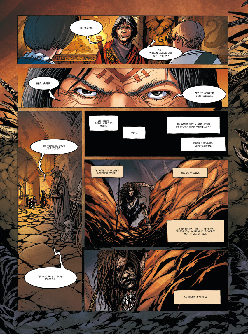 'Vertel ons het verhaal van de eerste draak ...' vragen drie leerlingen aan de bewaakster van de zaal van de muurschilderingen. De bewaakster vertelt ze een sprookje. Dat van de prehistorische tijden, het verhaal van een stam die bij een magische berg komt, een berg met veel wild, maar waar beetje bij beetje mensen en dieren vervormen, gek worden. Wat verbergt deze berg? Misschien een vervloeking. Of ... een beest. Een draak. Dit is niet het verhaal van de eerste draak, maar van de vrouw die hem bestreed. Een drakenridder in een tijd waarin dat woord nog niet bestond. Ontdek de Orde van de Drakenridders in de prehistorische tijd!
