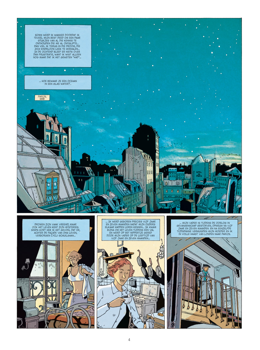 1958 - Marianne Bell is een knappe Parisienne, die dol is op wetenschap. Elke dag gaat ze naar haar werk in het museum van het Jardin des Plantes. Ze leidt een heel gewoon leventje, maar af en toe gebeurt er iets, wat helemaal niet zo gewoon is: om de vijf jaar en zeven maanden gebeurt er iets heel belangrijks in haar naaste familie. Alsof zich een onverklaarbare, vreemde cyclus voltrekt. Over twee maanden is het weer zover ... Wat gaat er nu weer gebeuren? Alles lijkt nog normaal: het onweert boven Parijs. Maar dan rijdt Marianne bijna iemand aan, die de stortregen probeert te ontvluchten. Marianne geeft de man een korte lift. Het blijkt een ontmoeting, hoe kort ook, die mogelijk haar lotsbestemming zal veranderen ... Een paar stappen naar het licht is een diepgaand avontuur, vergelijkbaar met de oorspronkelijke Blake & Mortimer-verhalen.