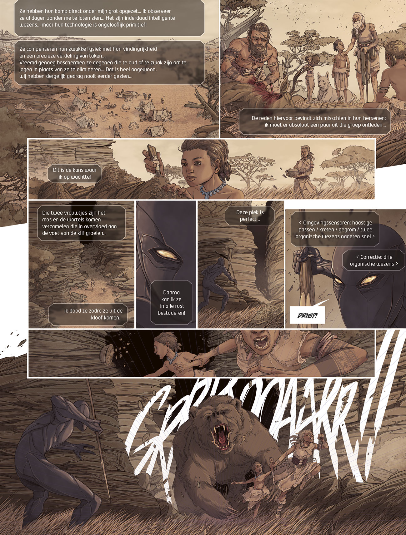 Wanneer zijn ruimteschip neerstort op die vreemde, blauwe planeet, beseft de enige overlevende androïde dat hij maar over een paar millennia beschikt om de hulpmiddelen te vinden die hem in staat kunnen stellen om terug te vliegen naar zijn planeet. Het tech- nologische niveau van die planeet is erg primitief, maar de bewoners leren snel. Nu is het aan hem om hen te leiden… • Wat als de geschiedenis- boeken vol leugens staan? Wat als de mens zijn lot niet in eigen handen heeft, maar al 9000 jaar wordt geleid door een onzicht- bare herder? • Een scenario van Antoine Tracqui (Hard Rescue), die hiermee een geweldig verhaal aflevert • Een nieuw, compleet verhaal in deze schitte- rende conceptreeks van Jean-Luc Istin (Dwergen, Elfen)